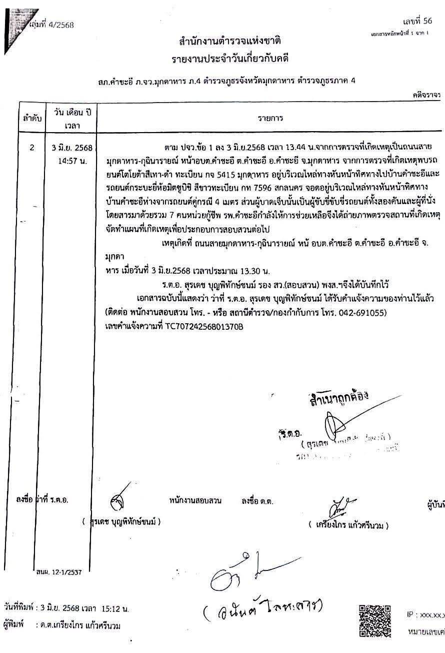 วันที่ 28 สิงหาคม 2568 นางสาวลลาวัลย์ ฤทธิวงค์ ได้ร้องเรียนต่อผู้สื่อข่าว สำนักข่าว CIA ประเทศไทย ประจำจังหวัดมุกดาหาร ว่า บิดาและมารดาของตนประสบอุบัติเหตุถูกรถยนต์พุ่งข้ามเลนมาชนจนได้รับบาดเจ็บสาหัสตั้งแต่วันที่ 3 มิถุนายน 2568 แต่จนถึงปัจจุบันคดียังไม่มีความคืบหน้า อีกทั้งฝ่ายผู้ก่อเหตุยังไม่ได้ถูกดำเนินคดี และไม่เคยเข้ามาให้การช่วยเหลือหรือเยียวยาความเสียหายแต่อย่างใด เหตุการณ์ดังกล่าวเกิดขึ้นบนถนนสาย มุกดาหาร–กุฉินารายณ์ บริเวณหน้า อบต.คำชะอี ต.คำชะอี อ.คำชะอี จ.มุกดาหาร เมื่อวันที่ 3 มิถุนายน 2568 โดยรถยนต์โตโยต้า สีเทา–ดำ ทะเบียน กจ 5415 มุกดาหาร ซึ่งมี นายประพง คนซื่อ ขับมาจาก อ.หนองสูง มุ่งหน้าไป อ.คำชะอี ได้ข้ามเลนไปชนอย่างแรงกับรถยนต์กระบะมิตซูบิชิ สีขาว ทะเบียน กท 7596 สกลนคร ที่ขับสวนทางมาแรงกระแทกทำให้รถทั้งสองคันพังเสียหาย และผู้ที่นั่งมาในรถกระบะคือ นายอนันต์ โลหะสาร คนขับ และ นางเพลินฉวี โลหะสาร ภรรยา ได้รับบาดเจ็บสาหัส กระดูกขาและนิ้วหัก ต้องเข้ารับการรักษาในโรงพยาบาลจนถึงขณะนี้ยังไม่สามารถกลับมาใช้ชีวิตปกติได้