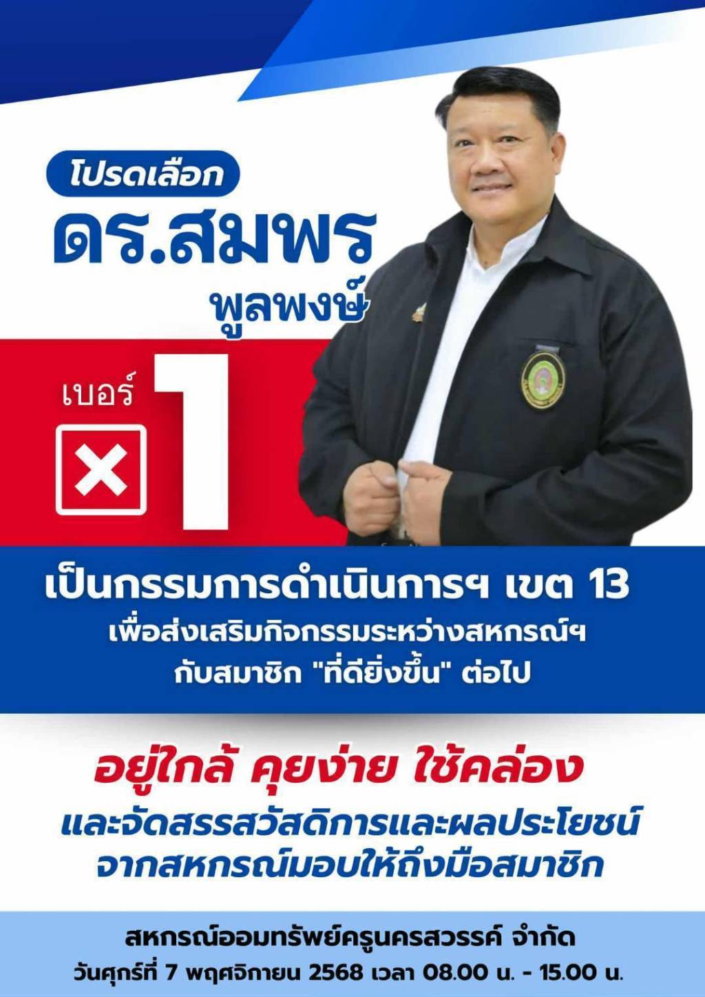 สำหรับการเลือกตั้งจะ มีการเลือกตั้งในวันศุกร์ที่ 7 พฤศจิกายน 2568 เวลา 8:00-15:00 น ในหน่วย เลือกตั้งต่างๆ ทั้งนี้ ดร.สมพร พูลพงษ์ ขออาสาเป็นคณะกรรมการดำเนินการเพื่อสหกรณ์และมวลสมาชิก เพื่อความมุ่งมั่นและตั้งใจ อย่างแรงกล้า โปรดเลือก เบอร์ 1 เขต 13