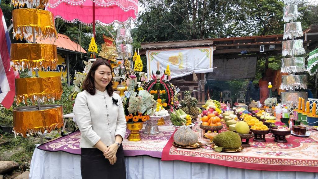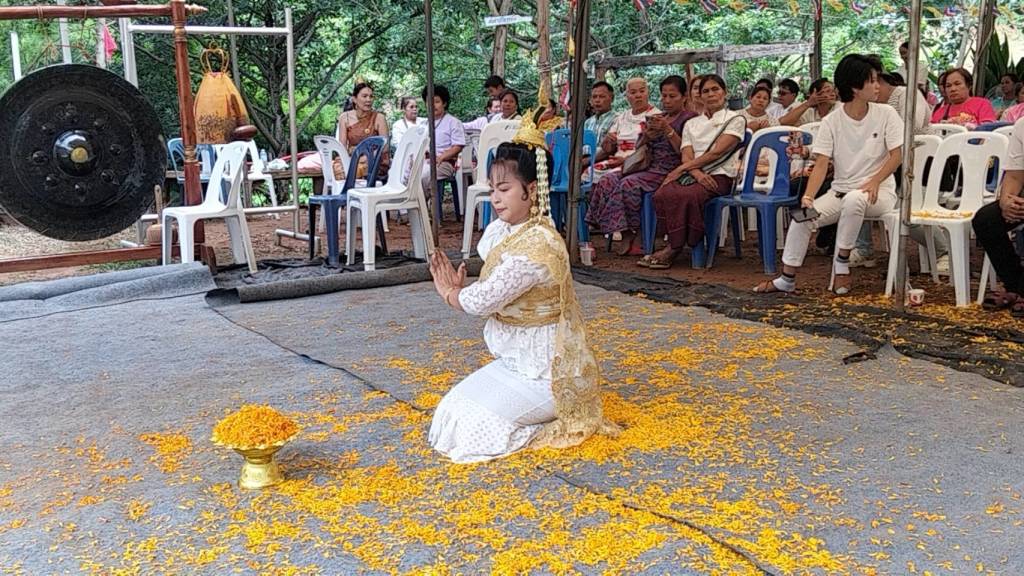 ช่วงเช้าได้จัดพิธีบวงสรวงเจ้าที่เจ้าทาง เพื่อความเป็นสิริมงคล มีพิธีรำถวายในบรรยากาศศรัทธาและความร่วมแรงร่วมใจของชุมชน โดยมี นางสาวพิมพร พรพฤติพันธ์ สมาชิกสภาผู้แทนราษฎรจังหวัดเพชรบูรณ์ เข้าร่วมในพิธีบวงสรวงครั้งนี้ด้วย หลังเสร็จพิธีบวงสรวง คณะเจ้าภาพได้เชิญร่วมโปรยดอกไม้ที่เครื่องบวงสรวงเพื่อความเป็นสิริมงคล ก่อนเข้าสู่พิธีถวายผ้าพระกฐินตามโบราณราชประเพณี ภายหลังเสร็จสิ้นพิธี สส.พิมพร พรพฤฒิพันธุ์ได้แจก “ยาสามัญประจำบ้าน” ให้แก่ผู้มาร่วมงานทอดกฐิน เป็นของที่ระลึกและเพื่อส่งเสริมสุขภาพแก่ประชาชนในพื้นที่ บรรยากาศโดยรวมเป็นไปด้วยความอบอุ่นและเปี่ยมด้วยศรัทธาในพระพุทธศาสนาและวันนี้ได้มีคณะญาติโยมที่ศรัทธามาออกโรงทานกันเป็นจำนวนมาก โดยเฉพาะเจ้าภาพที่เดินทางมาจากจังหวัดจันทบุรีได้นำข้าวเหนียวทุเรียนมาเปิดเป็นโรงทานพร้อมด้วยก๋วยเตี๋ยวลูกชิ้นปลา เพื่อให้ผู้ที่มาร่วมงานทอดกฐินครั้งนี้ได้รับประทานกันอย่างอิ่มหนำสำราญ