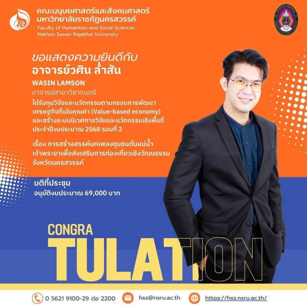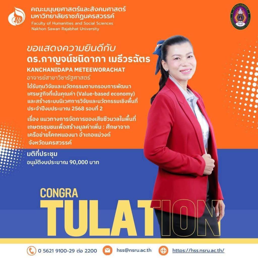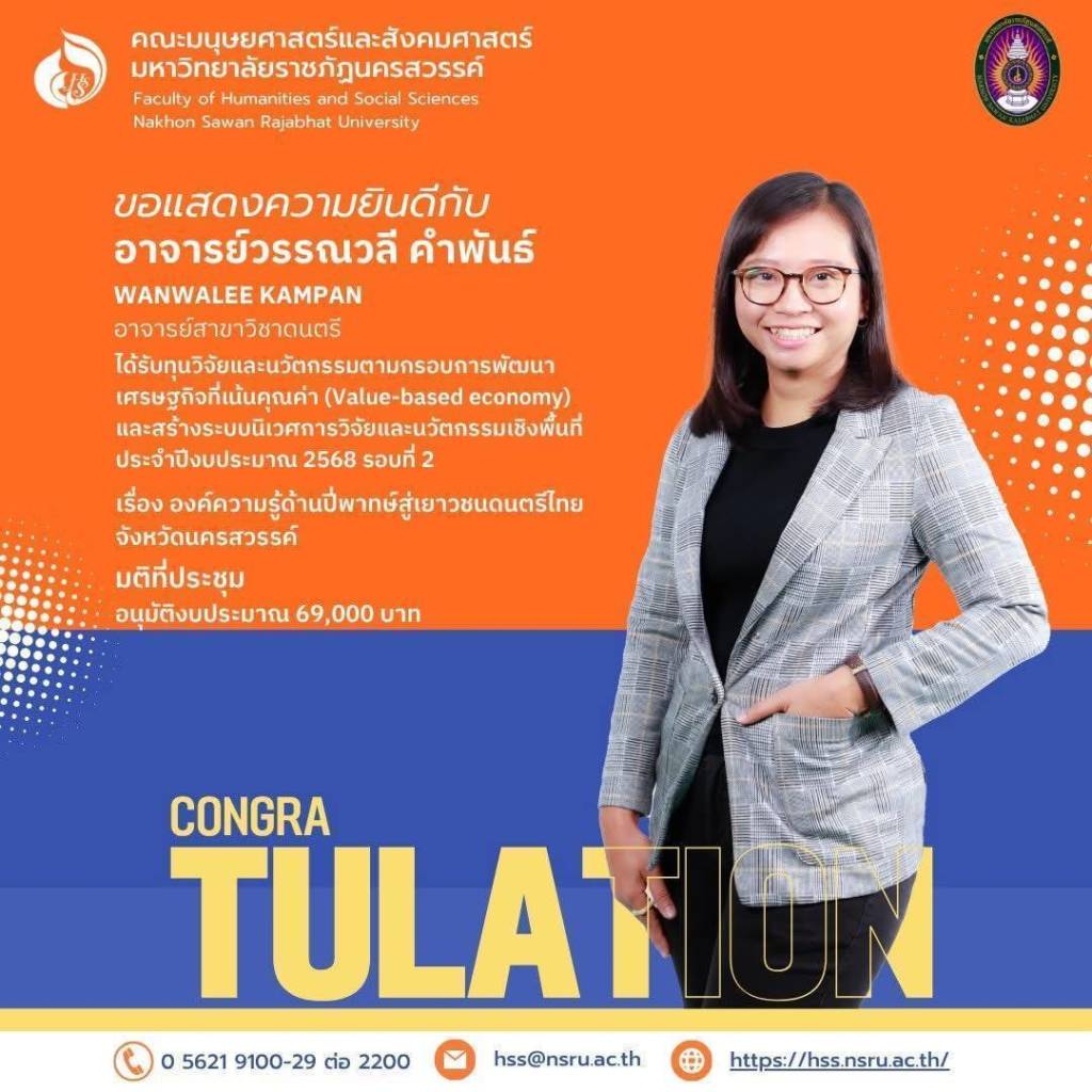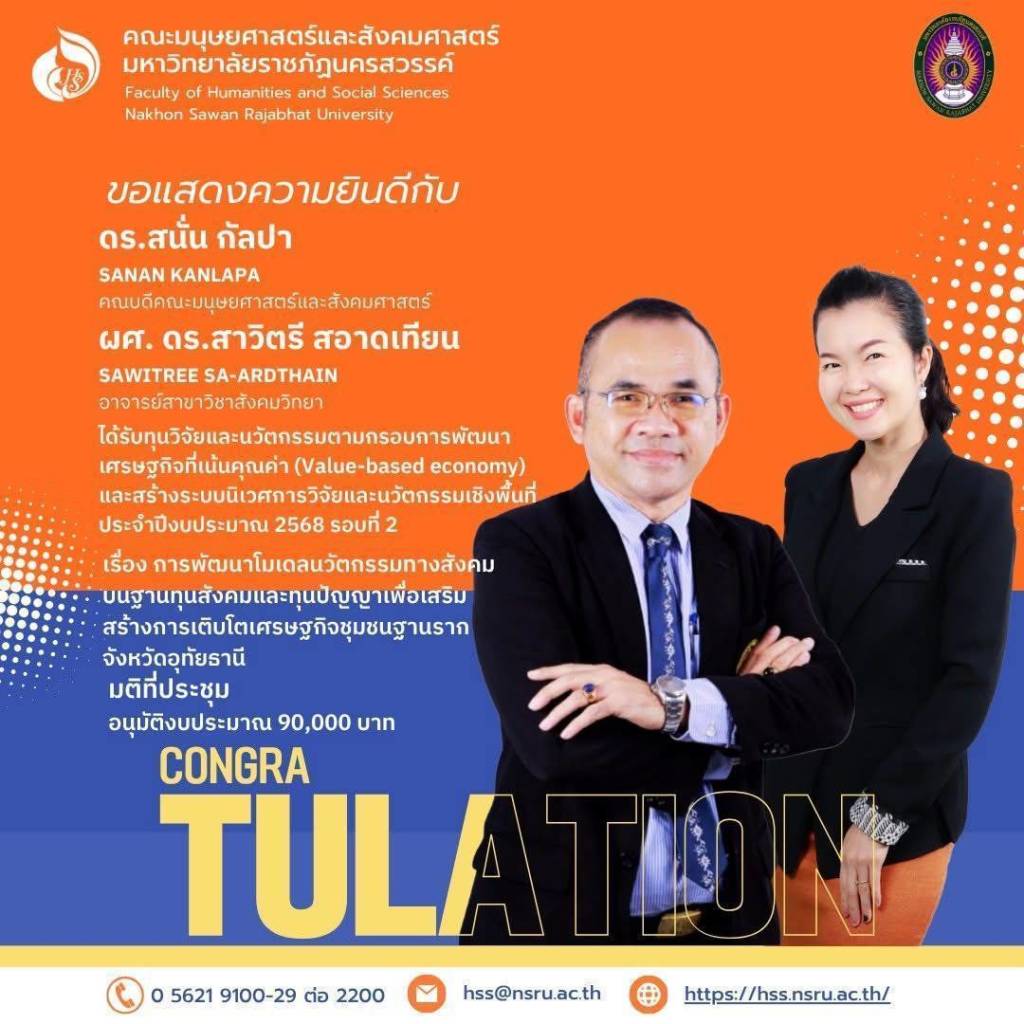 คณะมนุษยศาสตร์และสังคมศาสตร์ มหาวิทยาลัยราชภัฏนครสวรรค์ ขอแสดงความยินดีและชื่นชมในความมุ่งมั่นและความทุ่มเทของคณาจารย์ทุกท่าน ที่ได้สร้างสรรค์โครงการวิจัยและนวัตกรรมอันทรงคุณค่า เพื่อเป็นส่วนหนึ่งในการพัฒนาเศรษฐกิจและสังคมต่อไป