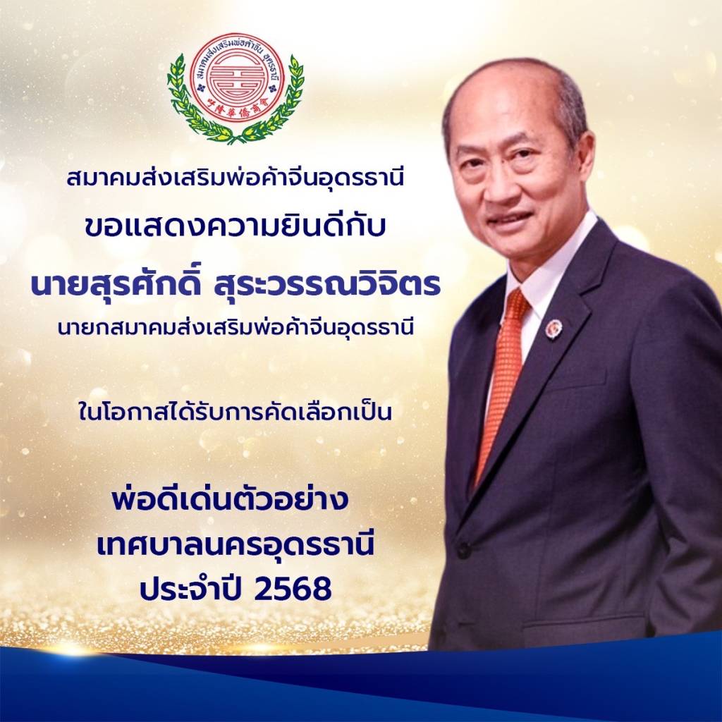 สมาคมส่งเสริมพ่อค้าจีนอุดรธานี ขอแสดงความยินดีกับ นายสุรศักดิ์ สุระวรรณวิจิตร นายกสมาคมส่งเสริมพ่อค้าจีนอุดรธานี ในโอกาสได้การคัดเลือกเป็นพ่อดีเด่นตัวอย่าง เทศบาลนครอุดรธานี ประจำปี 2568