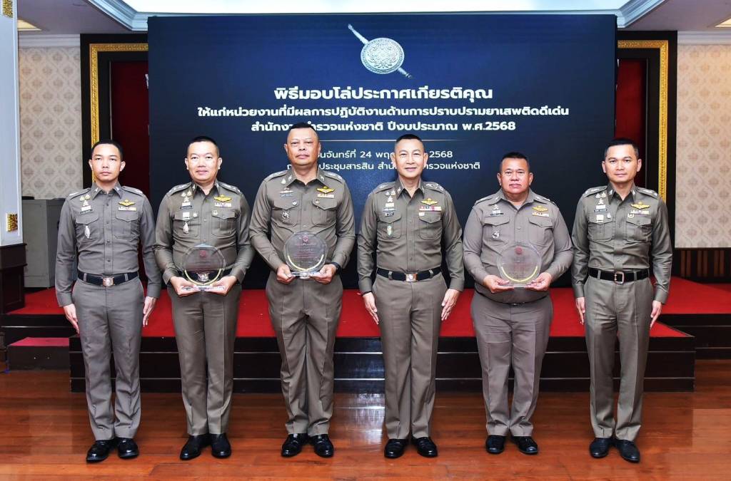 วันที่ 24 พฤศจิกายน 2568 พล.ต.อ.กิตติ์รัฐ พันธุ์เพ็ชร์ ผบ.ตร. เป็นประธานพิธีมอบประกาศเกียรติคุณแก่หน่วยงานที่ทำผลงานดีเด่นด้านการปราบปรามยาเสพติด ประจำปีงบประมาณ 2568 ณ ห้องประชุมสารสิน สำนักงานตำรวจแห่งชาติ เพื่อเชิดชูหน่วยงานและเจ้าหน้าที่ที่ทุ่มเทปฏิบัติงานในการแก้ไขปัญหายาเสพติด ในปีนี้ สถานีตำรวจภูธรเมืองอุดรธานี คว้ารางวัล สถานีตำรวจดีเด่นระดับใหญ่ โดยมี พ.ต.อ. พัฒนวงศ์ จันทร์พล ผู้กำกับการ สภ.เมืองอุดรธานี เข้ารับมอบรางวัลจาก ผบ.ตร. พิธีครั้งนี้สะท้อนความสำเร็จของหน่วยงานตำรวจทั่วประเทศ ที่ผลักดันนโยบายด้านการสกัดกั้นและปราบปรามยาเสพติดสู่การปฏิบัติได้อย่างมีประสิทธิภาพ ช่วยลดปัญหายาเสพติดในพื้นที่ได้อย่างเป็นรูปธรรม