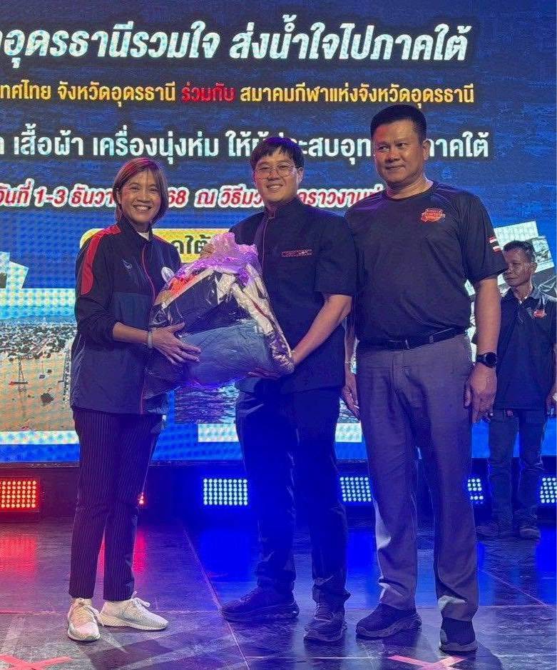 วันที่ 1 ธันวาคม 2568 ที่เวทีมวยชั่วคราวทุ่งศรีเมืองอุดรธานี นายจิณณ์ ชัยรัตน์ รองประธานหอการค้าจังหวัดอุดรธานี และนายกสมาคมกีฬาแห่งจังหวัดอุดรธานี รับมอบเสื้อผ้าเพื่อนำไปบริจาคให้แก่พี่น้องผู้ประสบอุทกภัยในพื้นที่ภาคใต้ โดยจะทำการมอบผ่าน ”โครงการคนไทยไม่ทิ้งกัน“ โดยหอการค้าจังหวัดอุดรธานี ร่วมกับท่าอากาศยานอุดรธานี สายการบินไทยไลอ้อนแอร์ และแอร์เอเชีย ส่งต่อไปยังท่าอากาศยานหาดใหญ่ จังหวัดสงขลา เพื่อมอบให้กับผู้ประสบอุทกภัยต่อไป