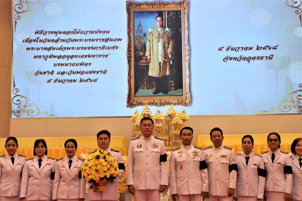 ต่อมาเมื่อเวลา 09.00น. ผวจ.อุดรธานี นำ หัวหน้าส่วนราชการ ข้าราชการ ประชาชนชาว จ.อุดรธานี ทุกหมู่เหล่า ประกอบพิธีถวายราชสักการะ วางพานพุ่มดอกไม้สด กล่าวน้อมรำลึกในพระมหากรุณาธิคุณ เบื้องหน้าพระบรมฉายาลักษณ์พระบาทสมเด็จพระบรมชนกาธิเบศร มหาภูมิพลอดุลยเดชมหาราช บรมนาถบพิตร ณ หอประชุมทองใหญ่ ศาลากลาง จ.อุดรธานี (เสร็จพิธี) พระบาทสมเด็จพระบรมชนกาธิเบศร มหาภูมิพลอดุลยเดชมหาราช บรมนาถบพิตร พระมหากษัตริย์ไทย ร.ที่ 9 แห่งราชวงศ์จักรี เสด็จพระบรมพระราชสมภพเมื่อวันที่ 5 ธ.ค. 2470 เสด็จสวรรคต 13 ต.ค. 2559 ทรงครองราชย์ 9 มิ.ย.2489 ทรงครองสิริราชสมบัติกว่า 70 ปี นับว่ายาวนานที่สุดในประเทศไทย พระองค์ทรงเป็นที่สรรเสริญทั้งในประเทศและต่างประเทศ เกี่ยวกับพระราชดำริในเรื่องปรัชญาเศรษฐกิจพอเพียง พระองค์ทรงจัดตั้งโครงการอันเนื่องมาจากพระราชดำริกว่า 4,877 โครงการ ทรงเป็นผู้อุปถัมภ์ โรงเรียน องค์การและมูลนิธิต่าง ๆ เลขาธิการสหประชาชาติ นายโคฟี แอนนัน (Kofi Annan) นักการทูตชาวกานา อดีตเลขาธิการสหประชาชาติ (UN) คนที่ 7 (ปี 1997-2006) ได้ถวายรางวัลความสำเร็จสูงสุดด้านการพัฒนามนุษย์แด่พระองค์