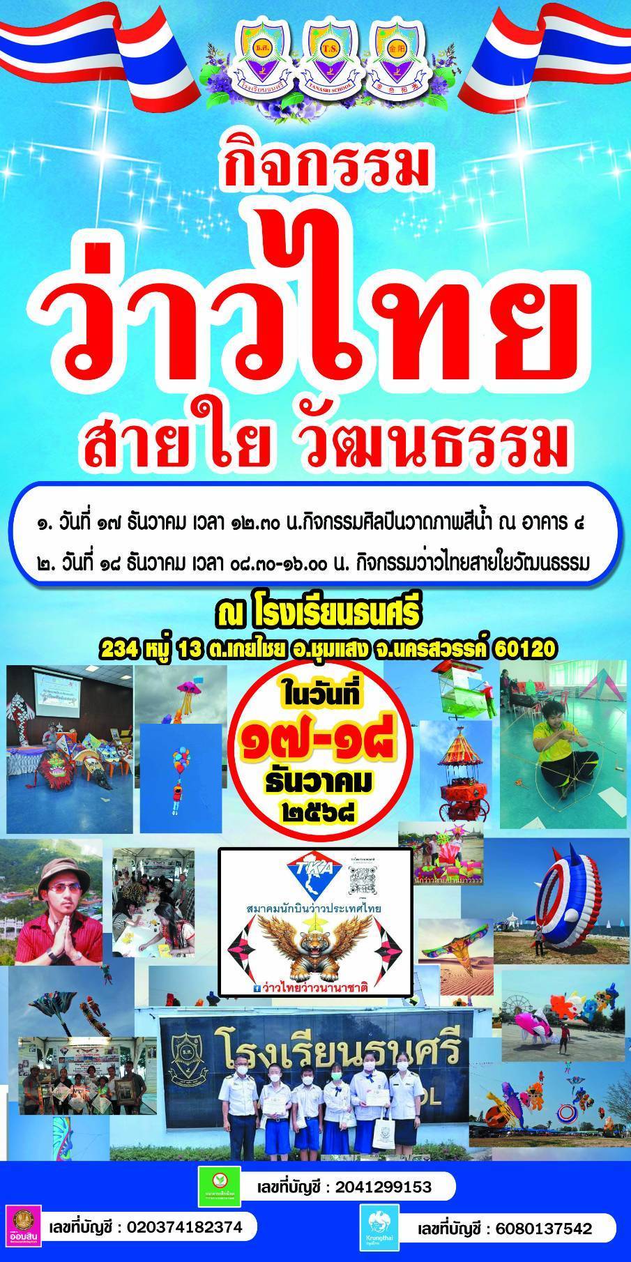 ว่าวไทย สายใยวัฒนธรรม โรงเรียนธนศรีชุมแสง จัดกิจกรรม ศิลปะสร้างสรรค์และว่าวไทย สายใยวัฒนธรรม พัฒนาเชิงพหุปัญญา นายสุธน อ่อนเฉย ผู้อำนวยการโรงเรียนธนศรี อำเภอชุมแสง จังหวัดนครสวรรค์ เปิดเผยว่า ด้วยโรงเรียนธนศรี ตระหนักถึงการส่งเสริมการพัฒนาเชิงพหุปัญญาเป็นส่วนสำคัญ ในการพัฒนาทักษะของผู้เรียนสร้างทักษะชีวิตในปัจจุบันและอมาคต โดยขัดกัจกรรมงานศิลปะสร้างสรรค์และว่าวไทยสายใยวัฒนธธรรม ในระหว่างวันที่ 17-18 ธันวาคม พ.ศ.2568