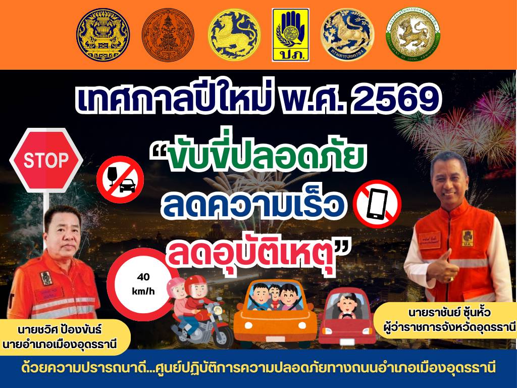 ภายใต้การอำนวยการของ นายชวิศ ป้องขันธ์ นายอำเภอเมืองอุดรธานี ได้ติดตั้งป้ายประชาสัมพันธ์การรณรงค์ป้องกันและลดอุบัติเหตุทางถนนในช่วงเทศกาลปีใหม่ พ.ศ. 2569 ภายใต้ชื่อ “ขับขี่ปลอดภัย ลดความเร็ว อุบัติเหตุ” เพื่อประชาสัมพันธ์สร้างความตระหนักรับรู้ให้กับประชาชนในพื้นที่เกี่ยวกับการป้องกันและลดอุบัติเหตุทางถนนในช่วงเทศกาลปีใหม่ ระหว่างวันที่ 30 ธันวาคม 2568 - 5 มกราคม 2569โดยติดตั้งป้ายบริเวณหน้าทางเข้าที่ว่าการอำเภอเมืองอุดรธานี