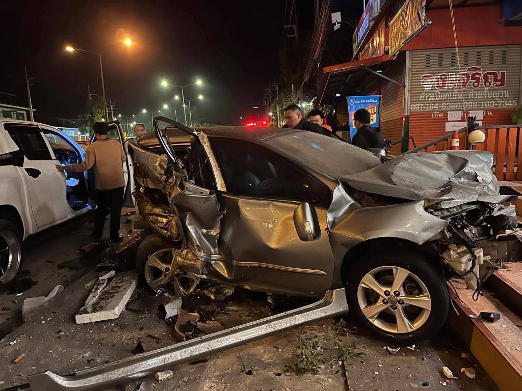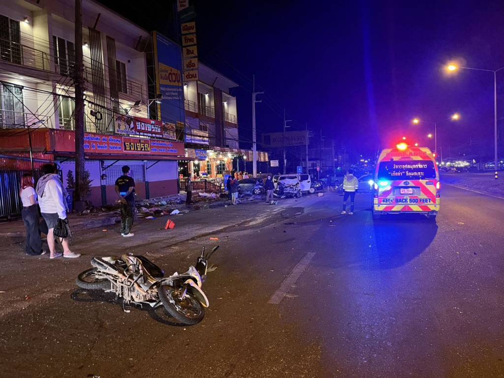 มุกดาหาร -รถกระบะเสียหลักเลยโค้ง พุ่งชนรถจอดหน้าร้านข้าวต้ม ถนนมุกดาหาร–ดอนตาล พังยับรวม 7 คัน