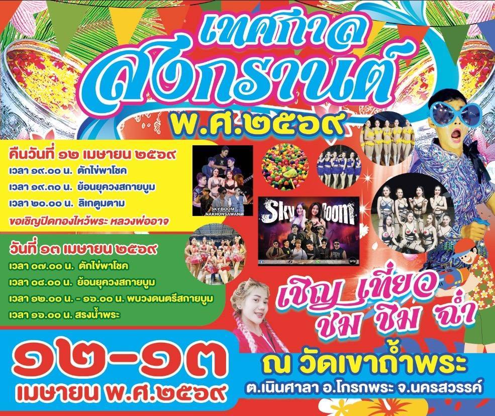 วัดเขาถ้ำพระ สรงน้ำพระ มีข่าวฝากประชาสัมพันธ์ล่วงหน้ามาจาก วัดเขาถ้ำพระ ตำบลตำบลเนินศาลา อำเภอโกรกพระ จังหวัดนครสวรรค์ ถึงงานเทศกาลสงกรานต์และสรงน้ำพระ ระหว่างวันที่ 12-13 เมษายน 2569 มีสรงน้ำพระ ปิดทองไหว้พระ ตักไข่พาโชค ภายในงานจะได้พบกับ รำวงย้อนยุค วงสกายบูมและลิเกตูมตาม อย่าลืมไปเที่ยวงานกันนะครับ