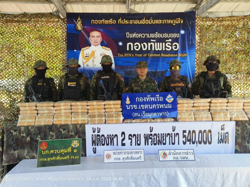 วันที่ 16 กุมภาพันธ์ ที่สถานีเรือมุกดาหาร นายชลิต ทิพย์คำ รองผู้ว่าราชการจังหวัดมุกดาหาร พล.ร.ต.ณรงค์ เอมดี ผู้บัญชาการหน่วยเรือรักษาความสงบเรียบร้อยตามลำแม่น้ำโขง (ผบ.นรข.) น.อ.แมนรัตน์ บุญสวัสดิ์ ผบ.นรข.เขตนครพนม และ น.ท.โอรส พุทธโค หัวหน้าสถานีเรือมุกดาหารแถลงผลการจับกุมขบวนการค้ายาเสพติดข้ามชาติ ยึดยาบ้าจำนวน 540,000 เม็ด พร้อมผู้ต้องหาชาวลาว 2 ราย