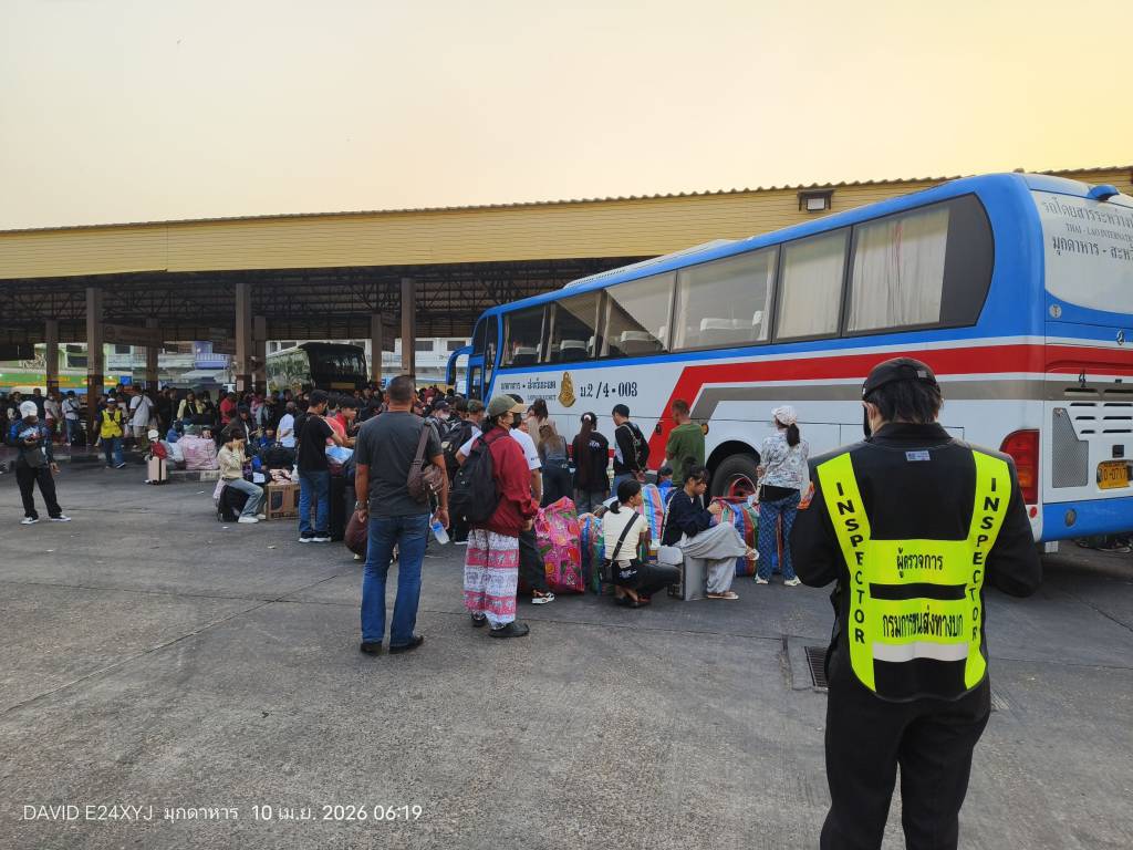 วันที่ 10 เมษายน 2569 บรรยากาศที่สถานีขนส่งผู้โดยสารจังหวัดมุกดาหารเป็นไปอย่างคึกคัก ตั้งแต่เวลา 06.00 น. มีแรงงานชาว สปป.ลาว จำนวนนับพันคนเดินทางมาจากกรุงเทพฯ และพื้นที่ภาคตะวันออก เพื่อรอต่อรถโดยสารระหว่างประเทศมุกดาหาร - สะหวันนะเขต กลับไปเฉลองเทศกาลสงกรานต์กับครอบครัว พบสัมภาระยอดฮิต "ถุงสายรุ้ง" วางเรียงรายเต็มสถานี