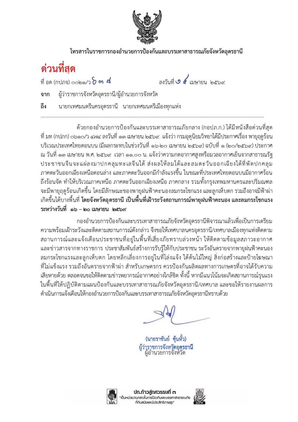 จังหวัดอุดรธานี แจ้งเตือน “พายุฤดูร้อนบริเวณประเทศไทยตอนบน” มีผลกระทบระหว่างวันที่ 16 - 20 เมษายน 2569