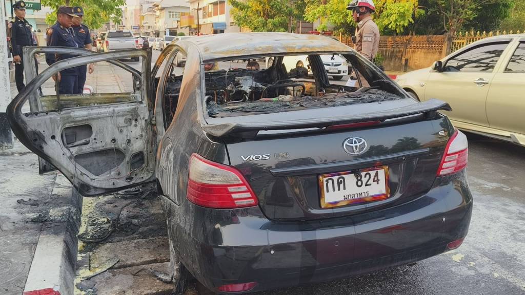 เมื่อถึงจุดเกิดเหตุ พบรถยนต์นั่งส่วนบุคคล ยี่ห้อโตโยต้า วีออส สีดำ หมายเลขทะเบียน กค 824 มุกดาหาร จอดอยู่ริมถนนฝั่งหน้าโรงพยาบาล โดยมีเปลวเพลิงกำลังลุกไหม้จากบริเวณห้องโดยสารและใต้ท้องรถอย่างรุนแรง เจ้าหน้าที่จึงเร่งใช้น้ำฉีดสกัดเพลิง ใช้เวลาประมาณ 5 นาที จึงสามารถควบคุมเพลิงไว้ได้สำเร็จ ท่ามกลางความแตกตื่นของประชาชนและผู้ใช้รถใช้ถนนบริเวณดังกล่าว