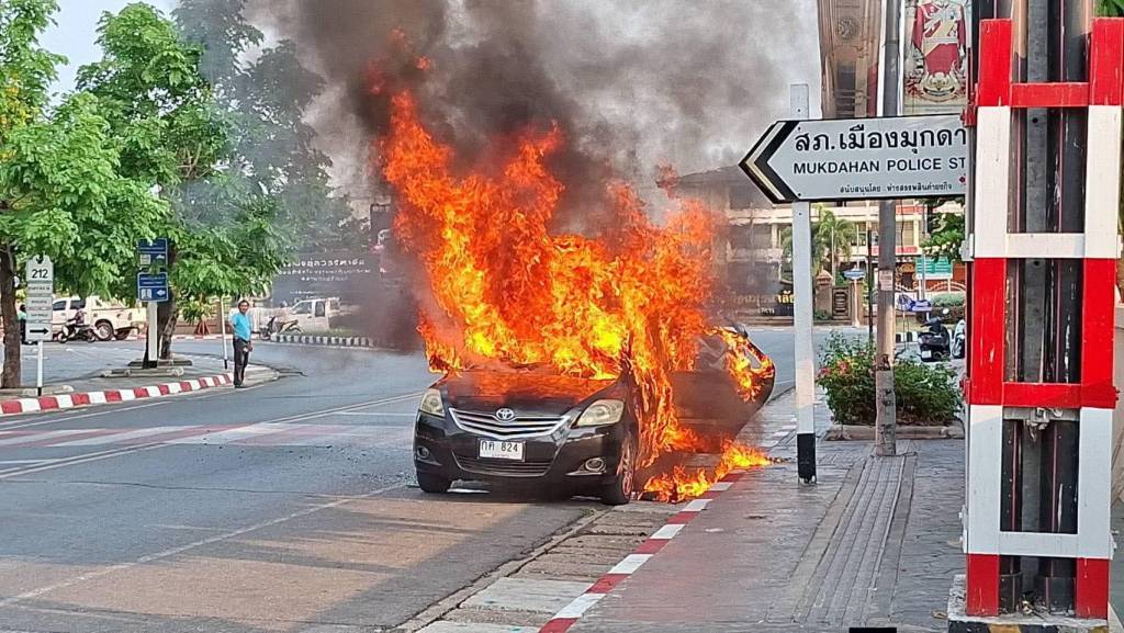 มุกดาหาร นาทีชีวิตของจริง! ได้กลิ่นไหม้แค่เสี้ยววินาที ตัดสินใจจอดรถทัน ช่วยชีวิตยกคันจากเหตุไฟไหม้กลางเมือง