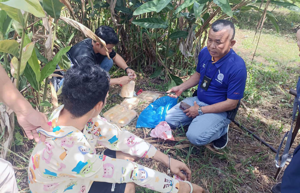 ทั้งนี้เจ้าหน้าที่ตำรวจชุดจับกุม นำโดย ร.ต.อ.วัลลภ ภูผานี รอง สว.(ป).สภ.เมืองบึงกาฬ ,ร.ต.ต.สุวิทย์ เย็นวัฒนา ,ด.ต.สุริยนด์ แก้วนารี,ด.ต.บัณฑิต พระราช ,ด.ต.ไมตรี ภูเป็ว ,ส.ต.อ.ชาณุพันธ์ ไขมีเพ็ชร ,ส.ต.ท.ปฏิพัทธ์ เทียมตามา เจ้าหน้าที่ตำรวจตรวจคนเข้าเมืองจังหวัดบึงกาฬ ว่าที่ร.ต.ต.ประวิทย์ คำแข็งขวา รอง สว.ตม.จว.บึงกาฬ,ค.ต. คชาชาญ ทิพยนตรี,ค.ต.ณัทพสิษฐ์ ศิริลักษณ์ ผบ.หมู่ ตม.จว.บึงกาฬ ตรวจค้นจุดพบของกลาง จุดที่ 1 พบยาบ้า 1,200 เม็ด พบซุกซ่อนอยู่ในกระเป๋าสะพายลายตารางสีดำเทา วางอยู่ด้านข้างที่นอนบ้านพักในสวนของผู้ต้องหา จุดที่ 2 พบยาบ้า 800 เม็ด พบซุกซ่อนอยู่ในกระเป๋าสะพายลายตารางสีดำเทา วางอยู่ด้านข้างที่นอนภายในบ้านพักของผู้ต้องหา จุดที่ 3 พบยาบ้า 158 เม็ด พบซุกซ่อนอยู่ในกระเป๋าสะพายลายตารางสีดำเทา วางอยู่ด้านข้างที่นอน จุดที่ 4 พบยาบ้าจำนวน 7 แพ็ค ห่อหุ้มด้วยกระดาษเทียนไข มีอักษรภาษาอังกฤษ Y-1 ภายในห่อหุ้มด้วยกระดาษสีขาว มีอักษรภาษาอังกฤษ A ภายในมียาบ้าจำนวน 10 ถุง ยาบ้า 1 ถุง มีจำนวน 200 เม็ด นับรวมยาบ้าได้ 42,000 เม็ด ห่อหุ้มด้วยถุงพลาสติกหูหิ้วสีฟ้า ซุกซ่อนอยู่ภายในพุ่มไม้ภายในสวนทุเรียน รวมยาบ้าของกลางจุดที่ 1-4 ทั้งหมด จำนวน 44,158 เม็ด พบอาวุธปืนสั้นชนิดประดิษฐ์ ใช้กระสุนขนาด จุด380 มม. จำนวน 2 กระบอก พร้อมกระสุนปืนขนาด จุด380 จำนวน 3 นัด และกระสุนปืนขนาด จุด 22 จำนวน 15 นัด แต่ไม้พบอาวุธปืน นอกจากนี้ยังพบเลื่อยโซ่ยนต์ยี่ห้อ Black Bull สีเขียว ความยาวบาร์ 25 นิ้ว พร้อมใช้งาน จำนวน 1 เครื่อง และเลื่อยโซ่ยนต์ยี่ห้อ Arto สีส้ม ความยาวบาร์ 25 นิ้ว พร้อมใช้งาน จำนวน 1 เครื่อง วางอยู่บริเวณใต้ถุนบ้านพักของผู้ต้องหา พบโทรศัพท์ยี่ห้อ เรียลมี่ สีฟ้า จำนวน 1 เครื่อง ซึ่งเป็นของนายนัท ผู้ต้องหาที่ 1 โทรศัพท์ยี่ห้อ Vivo สีแดง-ดำ จำนวน 1 เครื่อง ซึ่งเป็นของน.ส.ปาล์ม ผู้ต้องหาที่ 2 พบกระดาษบันทึกรายการซื้อขายยาเสพติด จำนวน 1 ฉบับ และเงินสดไทย จำนวน 10,800 บาท ซึ่งผู้ต้องหาที่ 1 รับว่าเป็นเงินที่ได้มาจากการจำหน่ายยาเสพติด (ตรวจยึดตามพรบ.ยาเสพติดฯ) พบกระเป๋าสะพายข้าง สีดำ-เทา จำนวน 1 ใบอยู่บริเวณภายในบ้านพักในสวนทุเรียนของผู้ต้องหา ในเขตบ้านคำภู ม.5 ต.ชัยพร อ.เมืองบึงกาฬ จ.บึงกาฬ