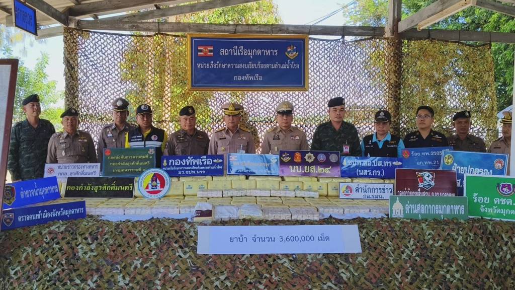 วันที่ 25 ตุลาคม 2567 นายวรญาณ บุญณราช ผู้ว่าราชการจังหวัดมุกดาหาร พล.ร.ต.ณรงค์ เอมดี ผู้บัญชาการหน่วยเรือรักษาความสงบเรียบร้อยตามลำน้ำโขง(นรข.) และ พล.ต.ต.ชัชชัย วงค์สุนะ ผู้บังคับการตำรวจภูธรจังหวัดมุกดาหาร ร่วมแถลงข่าว จับกุมยาเสพติดให้โทษประเภท ๑ (ยาบ้า) จำนวน 3,600,000 เม็ด ในพื้นที่จังหวัดมุกดาหาร