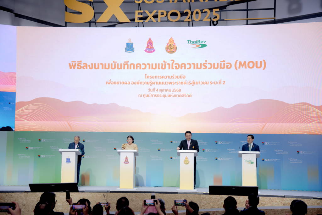 วันเสาร์ที่ 4 ตุลาคม 2568 เวลา 15.00 น. ในงาน Sustainability Expo 2025 (SX 2025) ณ ศูนย์การประชุมแห่งชาติสิริกิติ์ กรุงเทพมหานคร ดร.สุเมธ ตันติเวชกุล กรรมการและเลขาธิการมูลนิธิชัยพัฒนา พร้อมด้วย นางสุพร ตรีนรินทร์ เลขาธิการคณะกรรมการพิเศษเพื่อประสานงานโครงการอันเนื่องมาจากพระราชดำริ นายพิเชฐ โพธิ์ภักดี เลขาธิการคณะกรรมการการศึกษาขั้นพื้นฐาน และนายฐาปน สิริวัฒนภักดี ประธานเจ้าหน้าที่บริหารบริษัท ไทยเบฟเวอเรจ จำกัด (มหาชน) ร่วมลงนามบันทึกความเข้าใจความร่วมมือโครงการความร่วมมือเพื่อขยายผลองค์ความรู้ตามแนวพระราชดำริสู่เยาวชน ระยะที่ 2 ซึ่งเป็นความร่วมมือของ 4 หน่วยงานในการดำเนินงานโครงการความร่วมมือเพื่อนำองค์ความรู้ตามแนวพระราชดำริมาจัดทำสื่อการเรียนการสอน เผยแพร่และขยายผลไปยังเยาวชนที่กำลังศึกษาอยู่ในโรงเรียนบริเวณพื้นที่โครงการอันเนื่องมาจากพระราชดำริ และพื้นที่ห่างไกล ให้ได้รับความรู้อันก่อให้เกิดประโยชน์ต่อการพัฒนาศักยภาพและการดำเนินชีวิตให้กับเยาวชนและประชาชนได้อย่างมั่นคงและยั่งยืน ซึ่งได้ดำเนินโครงการฯ มาตั้งแต่ปี 2565 เป็นต้นมา และในงานนี้ยังมีพิธีมอบทุนสนับสนุนโครงการสานต่อองค์ความรู้ตามแนวพระราชดำริ ภายใต้โครงการความร่วมมือเพื่อขยายผลองค์ความรู้ตามแนวพระราชดำริสู่เยาวชน ประจำปี 2568 จำนวน 20 ทุน ให้แก่โรงเรียนที่น้อมนำองค์ความรู้ตามแนวพระราชดำริไปจัดทำเป็นโครงการที่แสดงให้เห็นถึงแนวความคิด และการสร้างสรรค์ไปสู่การปฏิบัติจริงอันก่อให้เกิดประโยชน์ทั้งนักเรียน ต่อโรงเรียน ชุมชน และสังคมต่อไป โอกาสนี้ ดร.สุเมธ ตันติเวชกุล กรรมการและเลขาธิการมูลนิธิชัยพัฒนา กล่าวถึงการดำเนินงานโครงการความร่วมมือเพื่อขยายผลองค์ความรู้ตามแนวพระราชดำริสู่เยาวชน การขับเคลื่อนเพื่อเป็นพลังสำคัญในการพัฒนาประเทศได้อย่างยั่งยืน และกล่าวปิดพิธีมอบทุนสนับสนุนโครงการฯ ผลการคัดเลือกโรงเรียนที่ได้รับมอบทุนสนับสนุนโครงการสานต่อองค์ความรู้ตามแนวพระราชดำริ ภายใต้โครงการความร่วมมือเพื่อขยายผลองค์ความรู้ตามแนวพระราชดำริสู่เยาวชน ประจำปี 2568 จำนวน 20 ทุนประกอบด้วย