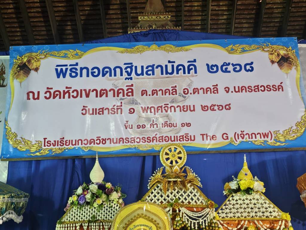 วันที่ 1 พฤศจิกายน 2568 ณ วัดหัวเขาตาคลี อำเภอตาคลี จังหวัดนครสวรรค์ นายธรธร จันทร์มะลิ เจ้าของและผู้รับใบอนุญาตโรงเรียนกวดวิชานครสวรรค์สอนเสริมหรือ The G นำคณะผู้บริหารและคณะครูไปร่วมเป็นเจ้าภาพทอดกฐินสามัคคี ประจำปี 2568 โดยมีนายพีระเดช ศิริวัณสาณฑ์ สมาชิกสำหรับผู้แทนราษฎร เขต 5 นครสวรรค์ พรรคภูมิใจไทย นายพัชรศักดิ์ พรหมมาศ รองนายกเทศมนตรีตำบลวังตะเคียน จังหวัดชัยนาท นายชูศักดิ์ เชิดชู สมาชิกสภาเทศบาลเมืองตาคลี อดีตผู้อำนวยการโรงเรียนบ้านโคกเจริญ อำเภอตาคลี จังหวัดนครสวรรค์ พร้อมประชาชนจำนวนมากเข้าร่วมพิธีในพิธี มีผู้ใจบุญมาร่วมตั้งโรงทานให้ผู้มาร่วมงานได้รับประทานฟรี มีข้าวกับข้าว ลาบ ก๋วยเตี๋ยว ขนมเค้ก ขนมจีนน้ำยา ขนมจีนแกงเขียวหวาน ฟักทองแกงบวด และมีการนำผ้ากฐินแห่วนรอบพระอุโบสถจำนวน 3 รอบ พร้อมมีวงดนตรีบรรเลงเพลง ทำให้ผู้เข้าร่วม แห่ผ้ากฐินร้อง เล่น เต้นรำกันอย่างสนุกสนาน ท่ามกลางสายฝนที่โปรยปรายลงมา ก่อนที่จะนำผ้ากฐินขึ้นสู่ศาลาการเปรียญ และประกอบพิธีถวายผ้ากฐิน นายธรธร จันทร์มะลิ พร้อมคณะครูร่วมกันรวบรวมเงินในฐานะเจ้าภาพ ได้เงินจำนวน 123,679 บาท และมีประชาชนร่วมทอดกฐินสามัคคี เป็นบริวารกฐิน ได้เงินอีกจำนวน 64,128 บาท รวม เป็นเงินทอดกฐินทั้งสิ้น 187,807 บาท
