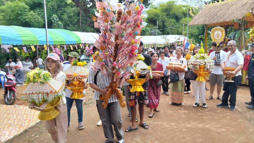 ช่วงเช้าได้จัดพิธีบวงสรวงเจ้าที่เจ้าทาง เพื่อความเป็นสิริมงคล มีพิธีรำถวายในบรรยากาศศรัทธาและความร่วมแรงร่วมใจของชุมชน โดยมี นางสาวพิมพร พรพฤติพันธ์ สมาชิกสภาผู้แทนราษฎรจังหวัดเพชรบูรณ์ เข้าร่วมในพิธีบวงสรวงครั้งนี้ด้วย หลังเสร็จพิธีบวงสรวง คณะเจ้าภาพได้เชิญร่วมโปรยดอกไม้ที่เครื่องบวงสรวงเพื่อความเป็นสิริมงคล ก่อนเข้าสู่พิธีถวายผ้าพระกฐินตามโบราณราชประเพณี ภายหลังเสร็จสิ้นพิธี สส.พิมพร พรพฤฒิพันธุ์ได้แจก “ยาสามัญประจำบ้าน” ให้แก่ผู้มาร่วมงานทอดกฐิน เป็นของที่ระลึกและเพื่อส่งเสริมสุขภาพแก่ประชาชนในพื้นที่ บรรยากาศโดยรวมเป็นไปด้วยความอบอุ่นและเปี่ยมด้วยศรัทธาในพระพุทธศาสนาและวันนี้ได้มีคณะญาติโยมที่ศรัทธามาออกโรงทานกันเป็นจำนวนมาก โดยเฉพาะเจ้าภาพที่เดินทางมาจากจังหวัดจันทบุรีได้นำข้าวเหนียวทุเรียนมาเปิดเป็นโรงทานพร้อมด้วยก๋วยเตี๋ยวลูกชิ้นปลา เพื่อให้ผู้ที่มาร่วมงานทอดกฐินครั้งนี้ได้รับประทานกันอย่างอิ่มหนำสำราญ