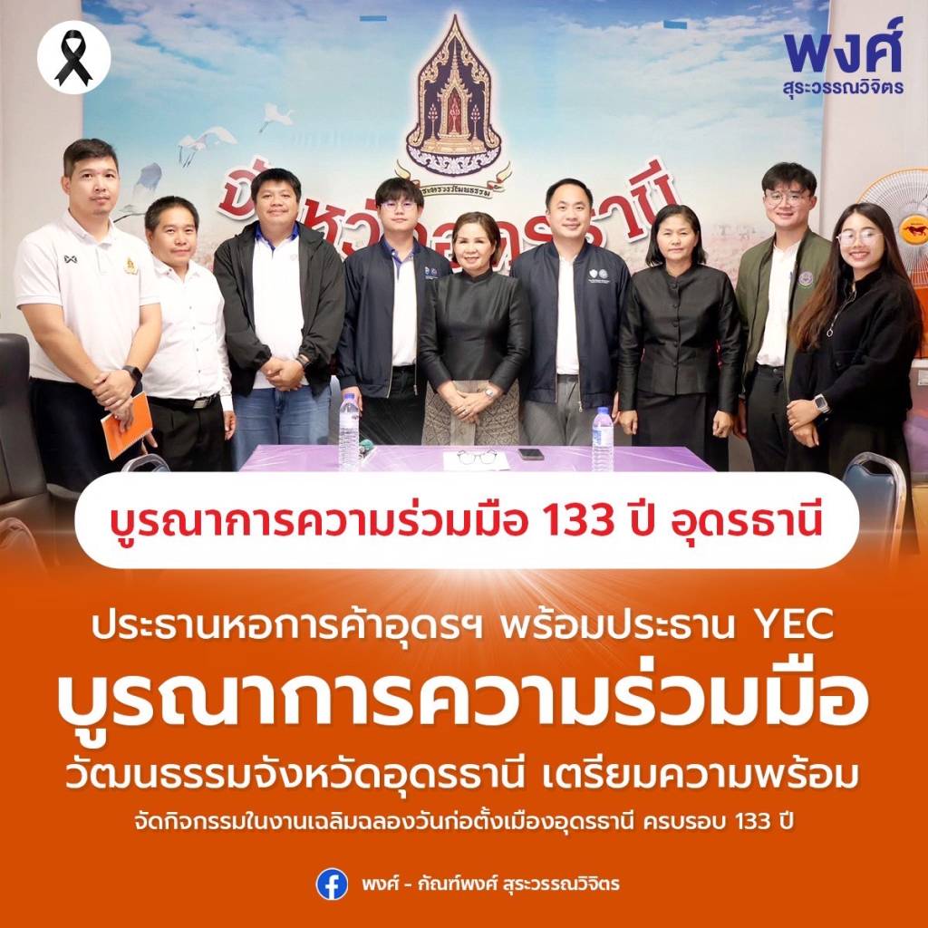 วันที่ 6 พฤศจิกายน 2568 เวลา 14.00 น. นายกัณฑ์พงศ์ สุระวรรณวิจิตร ประธานหอการค้าจังหวัดอุดรธานี พร้อมด้วย นายอติชาติ สุขบัญชา ประธาน YEC หอการค้าจังหวัดอุดรธานี นายรักอิสระ มุกดาม่วง สมาชิก YEC หอการค้าจังหวัดอุดรธานี ประชุมร่วมกับ นางรวงทอง พลธิราช วัฒนธรรมจังหวัดอุดรธานี และคณะ เพื่อเตรียมความพร้อมจัดกิจกรรมในงานเฉลิมฉลองวันก่อตั้งเมืองอุดรธานี ครบรอบ 133 ปี ระหว่างวันที่ 16-18 มกราคม 2569 ร่วมกัน