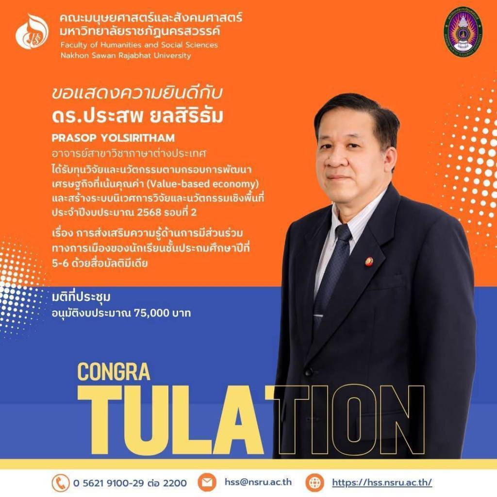 คณะมนุษยศาสตร์และสังคมศาสตร์ มหาวิทยาลัยราชภัฏนครสวรรค์ ขอแสดงความยินดีและชื่นชมในความมุ่งมั่นและความทุ่มเทของคณาจารย์ทุกท่าน ที่ได้สร้างสรรค์โครงการวิจัยและนวัตกรรมอันทรงคุณค่า เพื่อเป็นส่วนหนึ่งในการพัฒนาเศรษฐกิจและสังคมต่อไป
