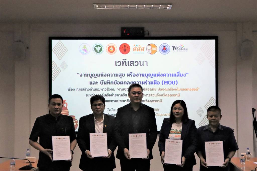 ทั้งนี้ ตามที่สมาคมเครือข่ายองค์กรงดเหล้า โดยสำนักงานเครือข่ายองค์กรงดเหล้า (สคล.) ภายใต้การสนับสนุนของกองทุนสนับสนุนการสร้างเสริมสุขภาพ (สสส.) ดำเนินงานภายใต้โครงการประชาคมงดเหล้าอีสานบนบูรณาการสร้างเสริมสุขภาวะ ลดปัจจัยเสี่ยง 11 จังหวัด (ภาคอีสานตอนบน) เพื่อสนับสนุนกลไกการทำงานระดับชุมชมชนสู่จังหวัด มีเป้าหมายขับเคลื่อนเชิงนโยบายในการปรับพฤติกรรมและสร้างสภาพแวดล้อมพื้นที่ที่ปลอดดอดภัย และขับเคลื่อนการดำเนินงานป้องกันนักดื่มหน้าใหม่ ให้สอดคล้องกับบริบทสังคมภาคอีสาน รวมกับสถานศึกษาษาต่างๆ และองค์กรปกครองส่วนท้องถิ่นในพื้นที่ ได้กำหนดจัดเวทีเสวนา "งานบุญญแห่งความสุข หรืองานบุญแห่งความเสี่ยง" และบันทึกข้อตกลงความร่วมมือ (MOU) การสร้างค่านิยมทางสังคม "งานบุญประเพณีปลอดภัย ปลอดเครื่องดื่มแอลกอฮอล์" ระหว่างภาคีเครือข่ายภาครัฐ อบจ.อุดรธานี และภาคประชาสังคม ใน จ.อุดรธานี