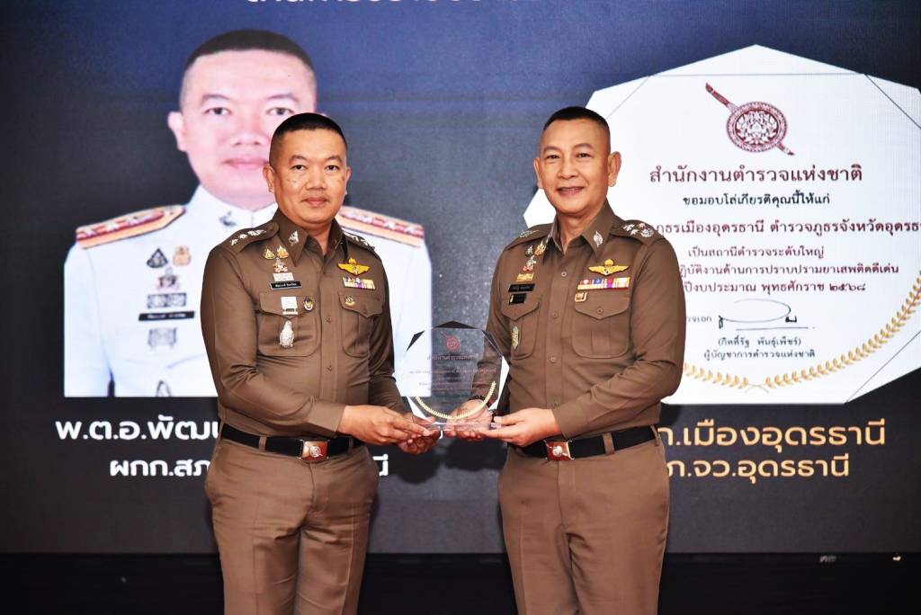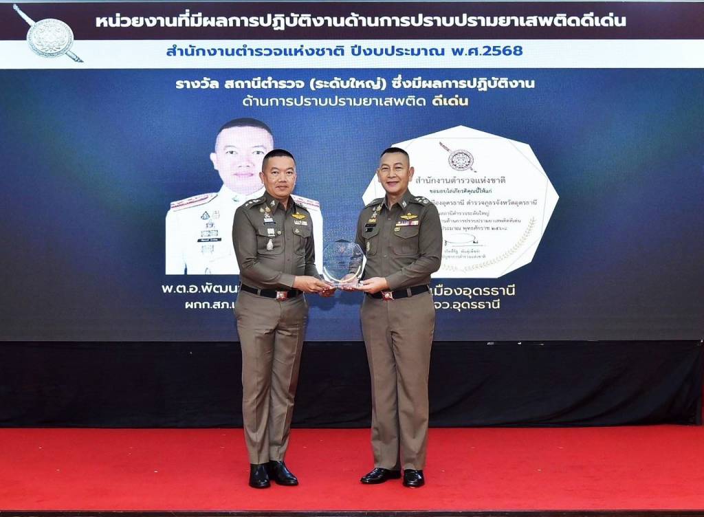 วันที่ 24 พฤศจิกายน 2568 พล.ต.อ.กิตติ์รัฐ พันธุ์เพ็ชร์ ผบ.ตร. เป็นประธานพิธีมอบประกาศเกียรติคุณแก่หน่วยงานที่ทำผลงานดีเด่นด้านการปราบปรามยาเสพติด ประจำปีงบประมาณ 2568 ณ ห้องประชุมสารสิน สำนักงานตำรวจแห่งชาติ เพื่อเชิดชูหน่วยงานและเจ้าหน้าที่ที่ทุ่มเทปฏิบัติงานในการแก้ไขปัญหายาเสพติด ในปีนี้ สถานีตำรวจภูธรเมืองอุดรธานี คว้ารางวัล สถานีตำรวจดีเด่นระดับใหญ่ โดยมี พ.ต.อ. พัฒนวงศ์ จันทร์พล ผู้กำกับการ สภ.เมืองอุดรธานี เข้ารับมอบรางวัลจาก ผบ.ตร. พิธีครั้งนี้สะท้อนความสำเร็จของหน่วยงานตำรวจทั่วประเทศ ที่ผลักดันนโยบายด้านการสกัดกั้นและปราบปรามยาเสพติดสู่การปฏิบัติได้อย่างมีประสิทธิภาพ ช่วยลดปัญหายาเสพติดในพื้นที่ได้อย่างเป็นรูปธรรม
