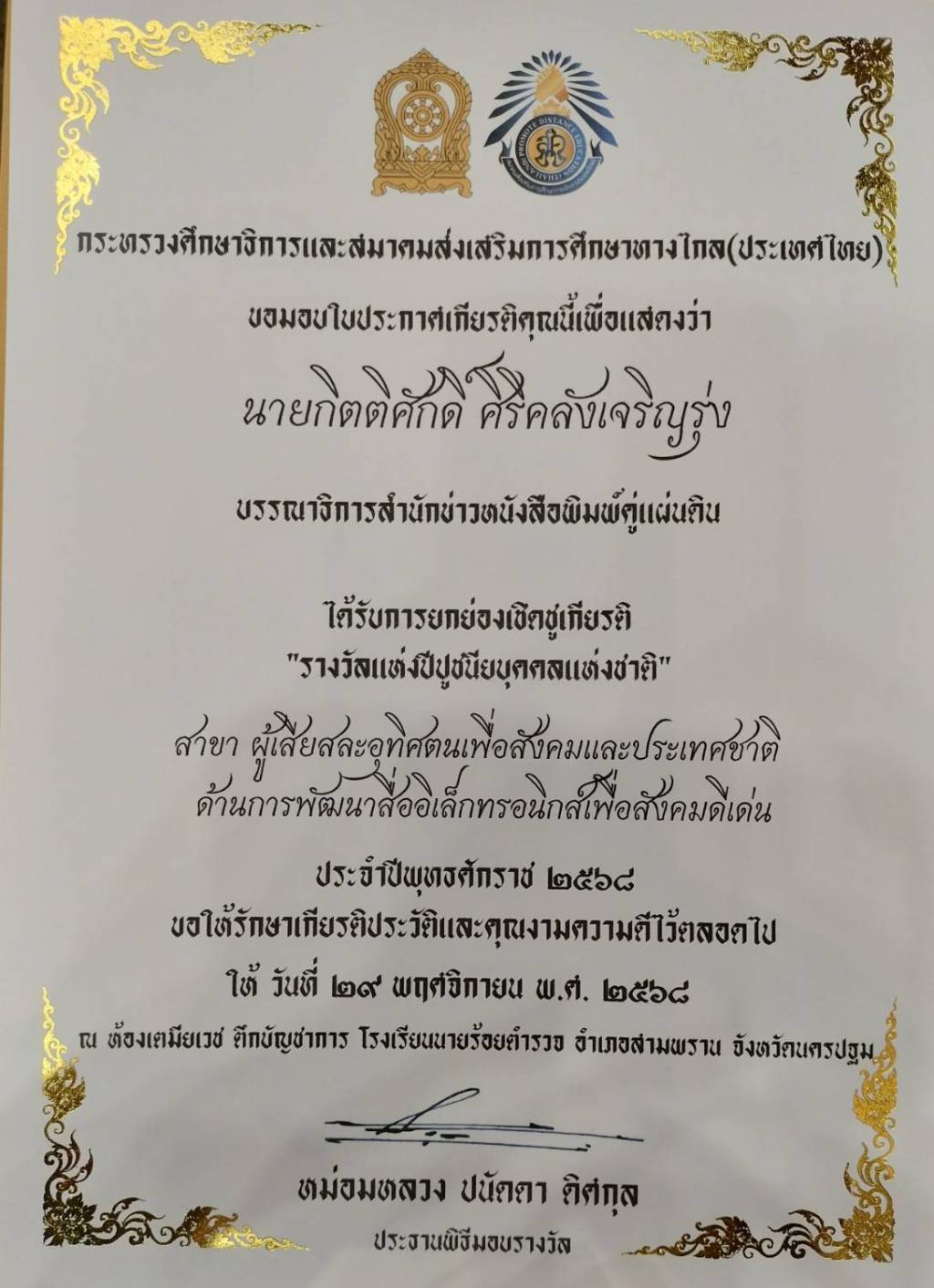 วันที่ 29 พฤศจิกายน 2568 ณ ห้องเตมียเวส โรงเรียนนายร้อยตำรวจ อำเภอสามพราน จังหวัดนครปฐม กระทรวงศึกษาธิการร่วมกับสมาคมส่งเสริมการศึกษาทางไกล (ประเทศไทย) จัดงานโครงการตอบแทนคุณแผ่นดินยกย่องเชิดชูเกียรติ คนดีของสังคม ครั้งที่ 5 ประจำปี 2568 มอบรางวัลแห่งปีปูชนียบุคคลแห่งชาติ โดยหม่อมหลวงปนัดดา ดิศกุล เป็นประธานในพิธีมอบรางวัล ในครั้งนี้มีบุคคลหลายสาขาอาชีพทั่วทุกภูมิภาคในประเทศไทย เข้ารับมอบ "รางวัลแห่งปีปูชนียบุคคลแห่งชาติ" โครงการตอบแทนคุณแผ่นดินยกย่องเชิดชูเกียรติคนดีของสังคม เพื่อเป็นขวัญและกำลังใจให้กับคนทำความดีโดยมีผู้ได้รับมอบรางวัลแห่งปีปูชนียกบุคคลแห่งชาติทั่วประเทศ จำนวน 718 ราย หม่อมหลวงปนัดดา ดิศกุล กล่าวแสดงความยินดีกับทุกท่านที่ได้รับคัดเลือกผ่านการพิจารณาของคณะกรรมการสรรหาผ่านเข้ามารับ "รางวัลแห่งปีปูชนียบุคคลแห่งชาติ" ในครั้งนี้ ขอให้ทุกท่านรักษาเกียรติประวัติและคุณความดีนี้ไว้ตลอดไป