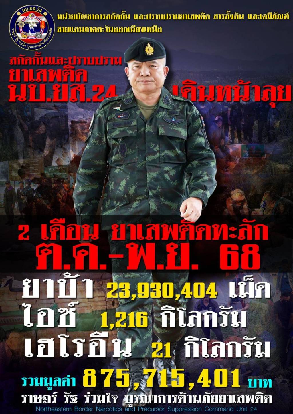 พลโท วีระยุทธ รักศิลป์ แม่ทัพภาคที่ 2 ในฐานะผู้บัญชาการหน่วยบัญชาการสกัดกั้น และปราบปรามยาเสพติด สารตั้งต้น และเคมีภัณฑ์ชายแดน ภาคตะวันออกเฉียงเหนือ (มทภ.2/ผบ.นบ.ยส.24) บูรณาการแก้ไขปัญหายาเสพติดในพื้นที่ชายแดนภาคตะวันออกเฉียงเหนือในรอบ 2 เดือน ( ต.ค.-พ.ย.68) ร่วมกับผู้ว่าราชการจังหวัด, หัวหน้าหน่วยงานความมั่นคง ทหาร ตำรวจ และหัวหน้าส่วนราชการที่เกี่ยวข้องในพื้นที่ 7 จังหวัด 25 อำเภอชายแดนภาคตะวันออกเฉียงเหนือ สกัดกั้นป้องกันปราบปรามและแก้ไขปัญหายาเสพติดเกิดประสิทธิภาพสูงสุด เนื่องด้วยสถานการณ์ปัญหาด้านยาเสพติดที่มีความรุนแรงในปัจจุบัน ทางรัฐบาล โดยนายกรัฐมนตรี จึงได้กำหนดนโยบายที่มุ่งเน้นในการแก้ไขปัญหายาเสพติดขึ้น โดยมีการกำหนดพื้นที่ชายแดนภาคตะวันออกเฉียงเหนือที่มีความจำเป็นเร่งด่วน ในการแก้ไขปัญหายาเสพติด ตามคำสั่งคณะกรรมการป้องกันและปราบปรามยาเสพติด และได้จัดตั้ง หน่วยบัญชาการสกัดกั้นและปราบปรามยาเสพติด สารตั้งต้น และเคมีภัณฑ์ชายแดนภาคตะวันออกเฉียงเหนือ หรือ นบ.ยส.24 ขึ้น โดยมอบหมายให้ “กองทัพภาคที่ 2” เป็นผู้รับผิดชอบ พื้นที่ 7 จังหวัด 25 อำเภอชายแดน