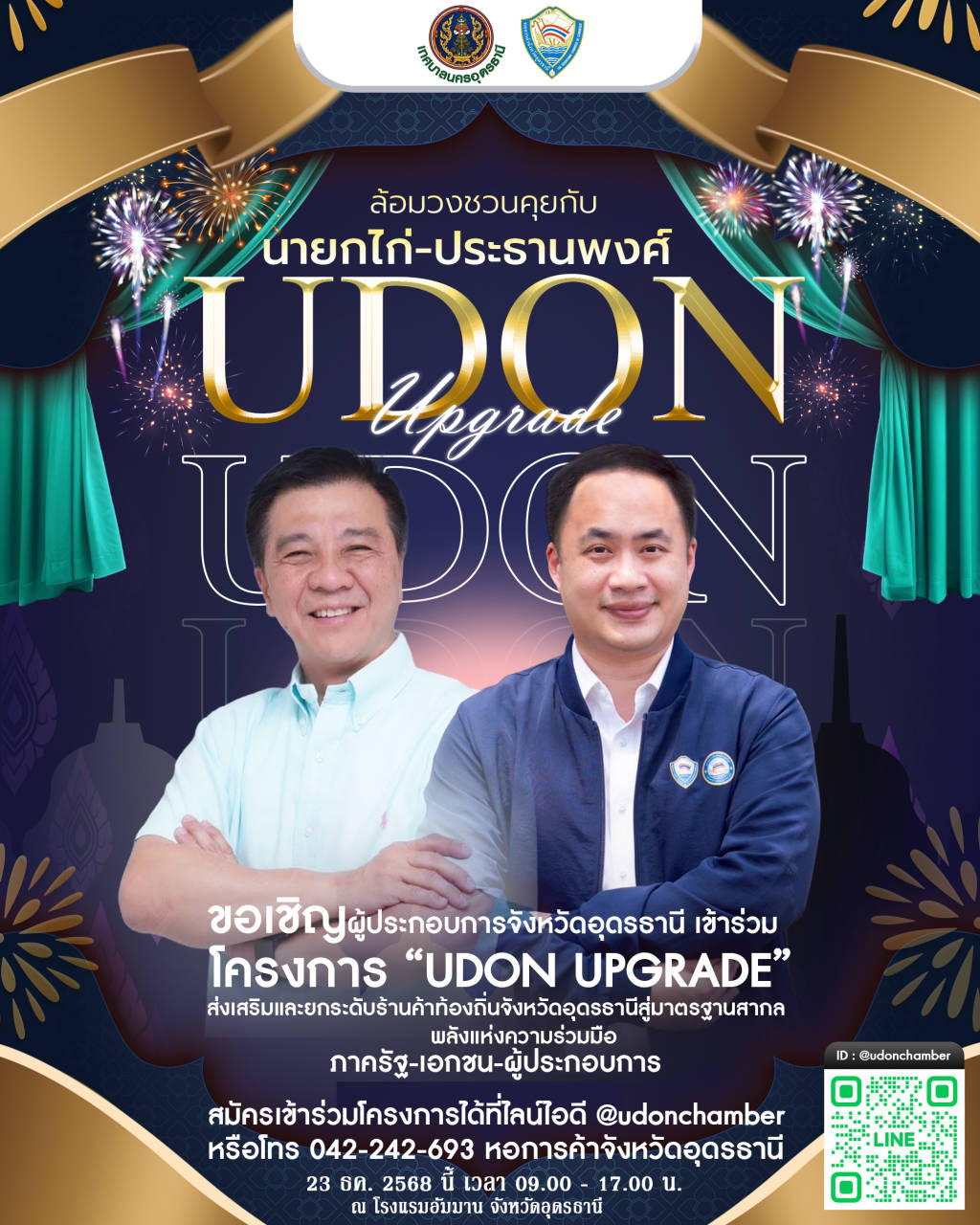 ของขวัญปีใหม่ สำหรับผู้ประกอบการจังหวัดอุดรธานี เทศบาลนครอุดรธานี ร่วมกับหอการค้าจังหวัดอุดรธานี และหน่วยงานพันธมิตร ขอเชิญผู้ประกอบการจังหวัดอุดรธานี ร่วมงานสัมมนาติดอาวุธให้ธุรกิจ “UDON UPGRADE” ยกระดับร้านค้าท้องถิ่นอุดรธานีสู่มาตรฐานสากล เตรียมความพร้อมการเป็นเจ้าบ้านที่ดีสู่งานระดับประเทศ และระดับนานาชาติ