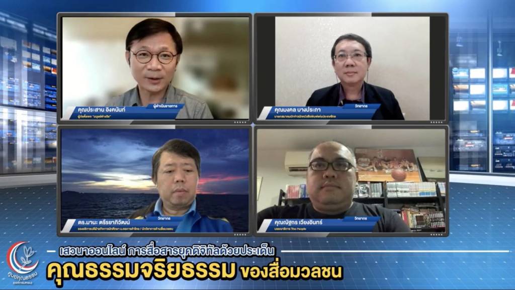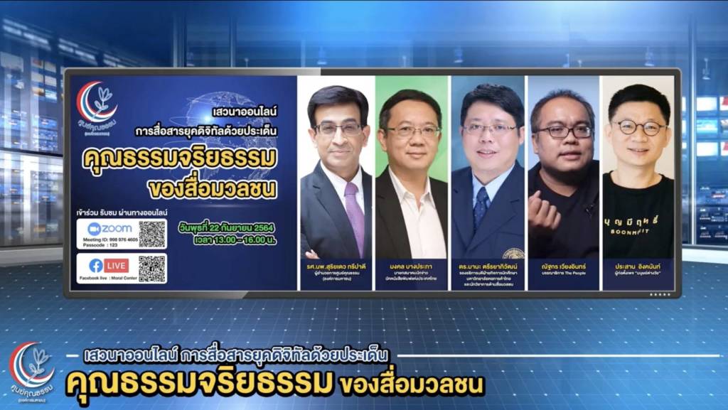22 กันยายน 2564 ศูนย์คุณธรรม (องค์การมหาชน) จัดเสวนาออนไลน์ ประเด็น “การสื่อสารยุคดิจิทัลด้วยประเด็นคุณธรรมจริยธรรมของสื่อมวลชน” ผ่านระบบ Zoom และ Facebook Live ศูนย์คุณธรรม โดย รศ.นพ.สุริยเดว ทรีปาตี ผู้อำนวยการศูนย์คุณธรรม (องค์การมหาชน) กล่าวว่า ศูนย์คุณธรรมเปิดประเด็นเรื่องของคุณธรรมในลักษณะแบบ Open มากขึ้นตามยุคสมัย ซึ่งจะพูดถึงเรื่องของพฤติกรรมที่ดี แล้วแต่ยุคสมัยว่า