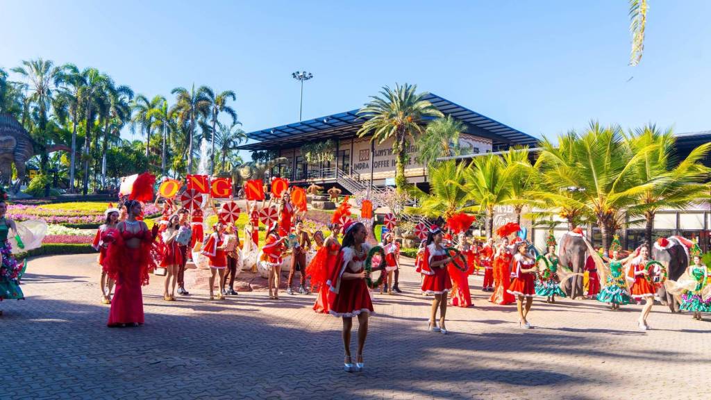 ภายในงานพบกับไฮไลต์สุดประทับใจ ขบวนพาเหรดคริสต์มาสสุดแฟนตาซี นำโดย ช้างแสนรู้ในชุดซานตาคลอส พร้อมนักแสดงชายหญิงแต่งกายเป็นซานตาคลอสและแซนตี้ ร่วมสร้างสีสัน ความสุข และรอยยิ้มให้กับนักท่องเที่ยวทุกเพศทุกวัย บรรยากาศอบอวลไปด้วยความสนุกสนาน เหมาะสำหรับการท่องเที่ยวแบบครอบครัวในช่วงวันหยุดยาวสวนนงนุชพัทยา ถือเป็นสวนที่ได้รับการจัดอันดับให้เป็น 1 ใน 10 สวนที่สวยที่สุดในโลก บนพื้นที่กว่า 1,700 ไร่ เต็มไปด้วยแหล่งท่องเที่ยวระดับโลก อาทิ