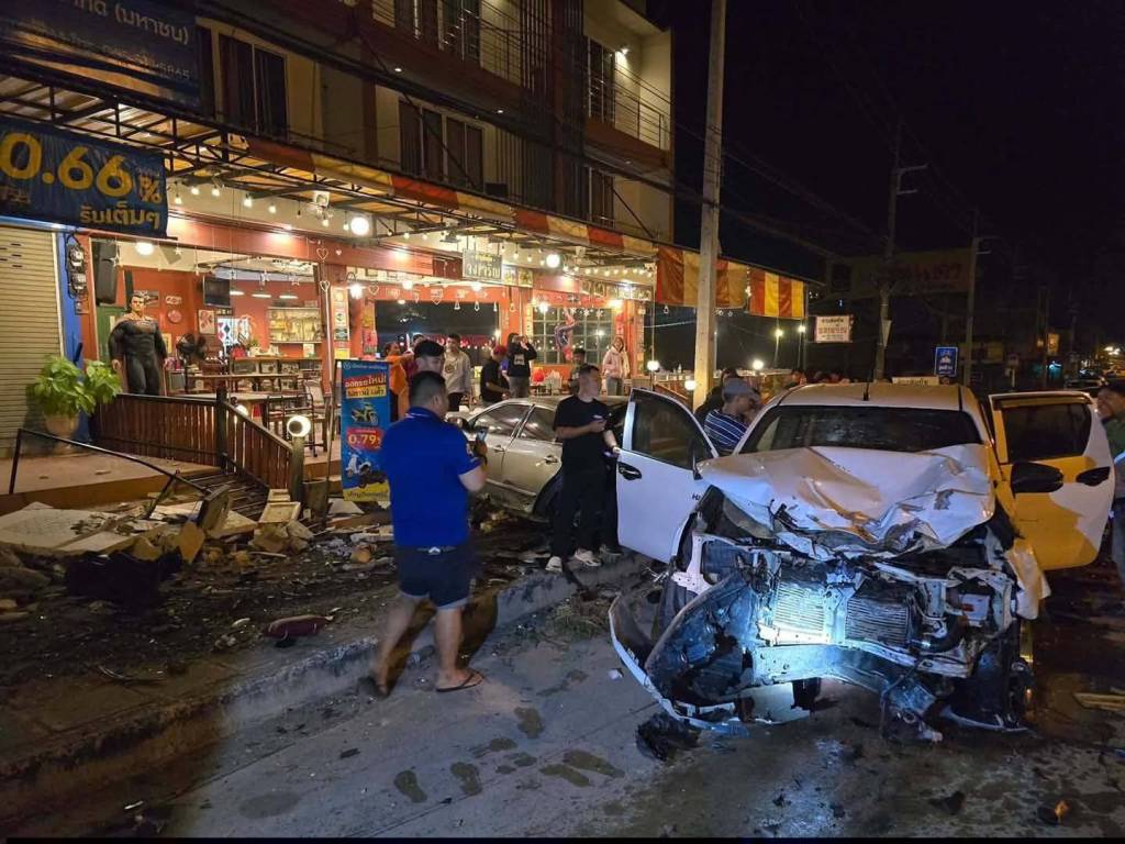 มุกดาหาร -รถกระบะเสียหลักเลยโค้ง พุ่งชนรถจอดหน้าร้านข้าวต้ม ถนนมุกดาหาร–ดอนตาล พังยับรวม 7 คัน