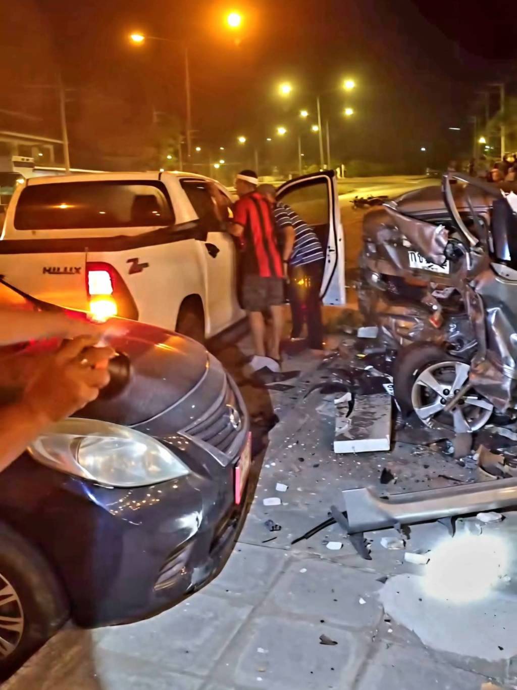 นอกจากนี้ยังพบรถจักรยานยนต์ฮอนด้า สีขาว ทะเบียน 1กง 9585 มุกดาหาร เสียหายบริเวณล้อหน้าและด้านหน้า โดยมีนายพชรพล เป็นเจ้าของ และรถจักรยานยนต์ฮอนด้า รุ่นสกู๊ปปี้ สีขาว ทะเบียน 1กย 6470 อุดรธานี กระจกมองข้างได้รับความเสียหาย จากการสอบสวนเบื้องต้น ผู้เห็นเหตุการณ์ให้การว่า รถกระบะโตโยต้า สีขาว ขับมาจากทางอำเภอดอนตาล มุ่งหน้าเข้าเมืองมุกดาหาร ด้วยความเร็ว เมื่อถึงบริเวณดังกล่าวซึ่งเป็นทางโค้ง ได้เสียหลักพุ่งชนรถที่จอดอยู่ข้างทางหน้าร้านข้าวต้ม ทำให้รถหลายคันได้รับความเสียหายดังกล่าว เจ้าหน้าที่อยู่ระหว่างตรวจสอบสาเหตุอย่างละเอียดและดำเนินการตามกฎหมายต่อไป