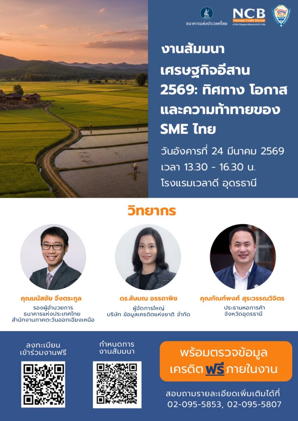 หอการค้าจังหวัดอุดรธานี ร่วมกับธนาคารแห่งประเทศไทย สำนักงานภาคตะวันออกเฉียงเหนือ และบริษัท ข้อมูลเครดิตแห่งชาติ จํากัด ขอเชิญร่วมงานสัมมนา “เศรษฐกิจอีสาน 2569: ทิศทาง โอกาส และความท้าทายของ SME ไทย” พบกับการวิเคราะห์แนวโน้มเศรษฐกิจ โอกาสทางธุรกิจ และความท้าทายที่ผู้ประกอบการ SME ไทยควรรู้ พร้อมรับฟังมุมมองจากผู้เชี่ยวชาญและวิทยากรชั้นนำ