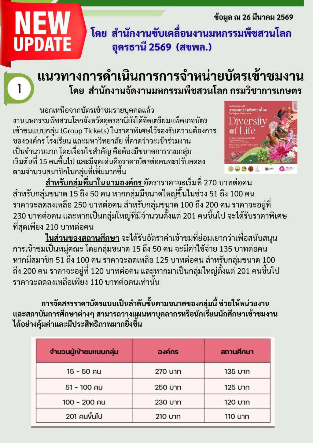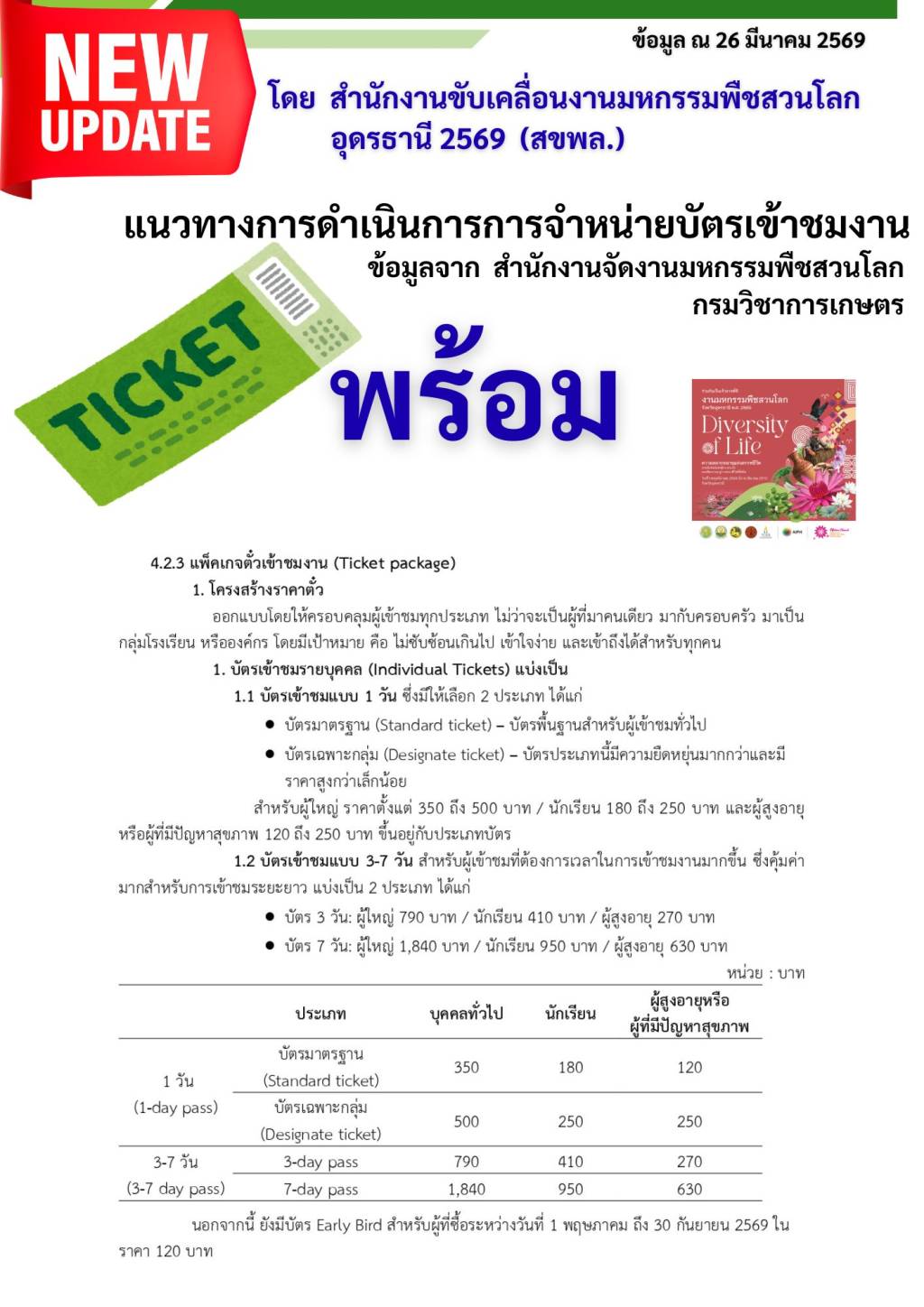 ราคาบัตรเข้าชม “พืชสวนโลกอุดรธานี 2569”
