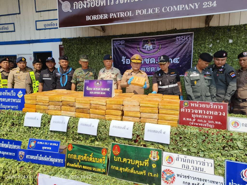 วันที่ 28 มีนาคม 2569 ที่กองร้อยตำรวจตระเวนชายแดนที่ 234 จังหวัดมุกดาหาร นายชลิต ทิพย์คำ รองผู้ว่าราชการจังหวัดมุกดาหาร พร้อมด้วย นายนที พรมภักดี นายอำเภอเมืองมุกดาหาร พ.ต.ท.ปรัชญลักษณ์ วิลาทัน รอง ผกก.หน.ร้อย ตชด.234 และหน่วยงานด้านความมั่นคงในพื้นที่ ร่วมกันแถลงข่าวการตรวจยึดยาบ้าจำนวนกว่า 2,000,000 เม็ด สืบเนื่องจากเมื่อวันที่ 27 มีนาคมที่ผ่านมา เจ้าหน้าที่ได้รับแจ้งจากสายลับว่าจะมีการลักลอบลำเลียงยาเสพติดล็อตใหญ่เข้ามาทางพื้นที่ริมฝั่งแม่น้ำโขง บริเวณห้วยแข้ ชุมชนศรีบุญเรืองใต้ ต.ศรีบุญเรือง อ.เมือง จ.มุกดาหาร ในช่วงเวลากลางคืน เจ้าหน้าที่จึงวางแผนจัดกำลังเข้าซุ่มเฝ้าตรวจทันที