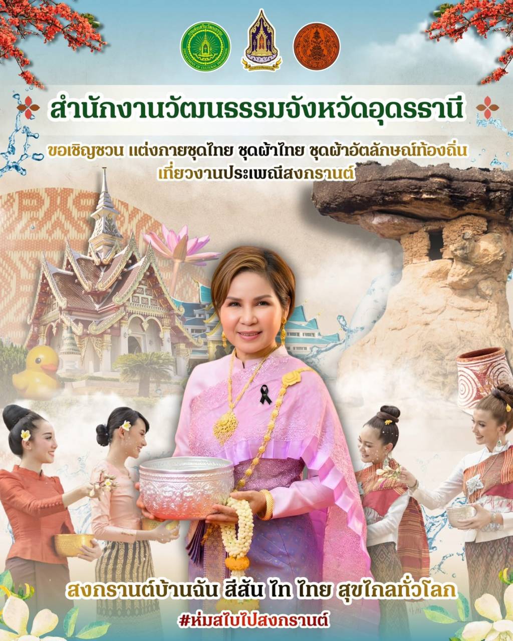 สำนักงานวัฒนธรรมจังหวัดอุดรธานี ขอร่วมเป็นส่วนหนึ่งในการร่วมรณรงค์ "แต่งชุดไทยและห่มสไบไปสงกรานต์" ท่านสามารถแต่งกายชุดไทย ชุดผ้าไทย ชุดผ้าอัตลักษณ์ท้องถิ่น เที่ยวงานประเพณีสงกรานต์ใกล้บ้านท่านได้