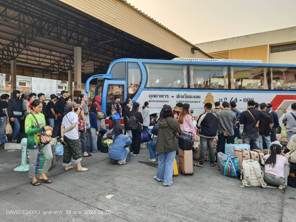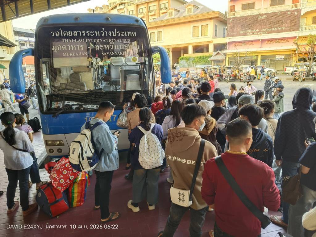 วันที่ 10 เมษายน 2569 บรรยากาศที่สถานีขนส่งผู้โดยสารจังหวัดมุกดาหารเป็นไปอย่างคึกคัก ตั้งแต่เวลา 06.00 น. มีแรงงานชาว สปป.ลาว จำนวนนับพันคนเดินทางมาจากกรุงเทพฯ และพื้นที่ภาคตะวันออก เพื่อรอต่อรถโดยสารระหว่างประเทศมุกดาหาร - สะหวันนะเขต กลับไปเฉลองเทศกาลสงกรานต์กับครอบครัว พบสัมภาระยอดฮิต "ถุงสายรุ้ง" วางเรียงรายเต็มสถานี