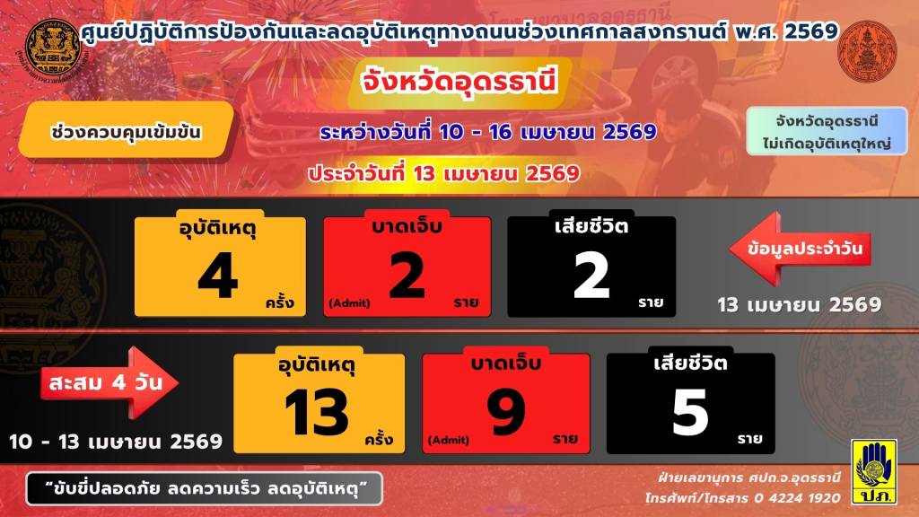ศูนย์อำนวยการความปลอดภัยทางถนนจังหวัดอุดรธานี ขอรายงานข้อมูลอุบัติเหตุทางถนนช่วงเทศกาลสงกรานต์ พ.ศ. 2569 ช่วงควบคุมเข้มข้น ระหว่างวันที่ 10 - 16 เมษายน 2569 ดังนี้