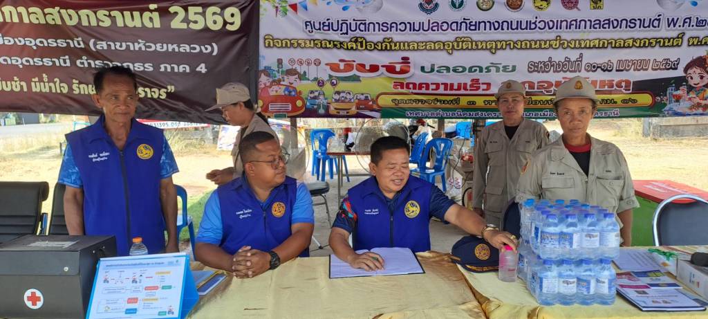 วันที่ 15 เมษายน 2569 เวลา 11.00 น. เป็นต้นไป นายชวิศ ป้องขันธ์ นายอำเภอเมืองอุดรธานี ลงพื้นที่ตรวจเยี่ยมและมอบน้ำดื่มให้กำลังใจการปฏิบัติหน้าที่ของเจ้าหน้าที่ประจำจุดตรวจหลัก ในการป้องกันและลดอุบัติเหตุทางถนนในช่วงเทศกาลสงกรานต์ พ.ศ. 2569 ณ จุดตรวจหลัก เส้นอุดรธานี-หนองบัวลำภู อบต.นิคมสงเคราะห์ โดยมีเจ้าหน้าที่องค์กรปกครองส่วนท้องถิ่น ตำรวจ กำนัน ผู้ใหญ่บ้าน และประชาชนจิตอาสา เข้าร่วม