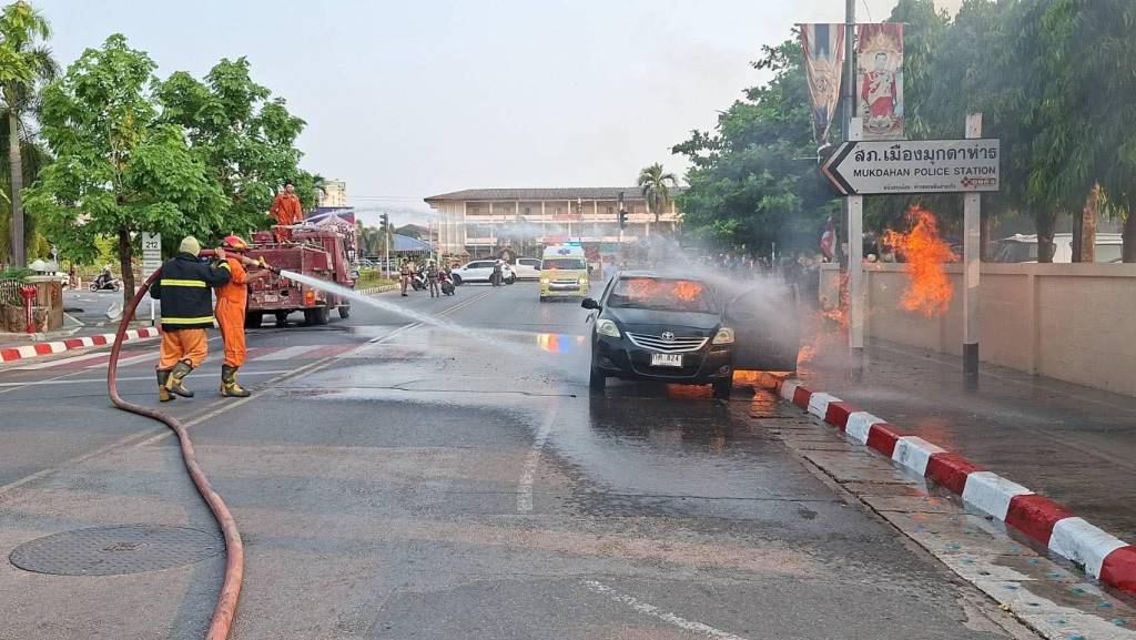 เมื่อถึงจุดเกิดเหตุ พบรถยนต์นั่งส่วนบุคคล ยี่ห้อโตโยต้า วีออส สีดำ หมายเลขทะเบียน กค 824 มุกดาหาร จอดอยู่ริมถนนฝั่งหน้าโรงพยาบาล โดยมีเปลวเพลิงกำลังลุกไหม้จากบริเวณห้องโดยสารและใต้ท้องรถอย่างรุนแรง เจ้าหน้าที่จึงเร่งใช้น้ำฉีดสกัดเพลิง ใช้เวลาประมาณ 5 นาที จึงสามารถควบคุมเพลิงไว้ได้สำเร็จ ท่ามกลางความแตกตื่นของประชาชนและผู้ใช้รถใช้ถนนบริเวณดังกล่าว