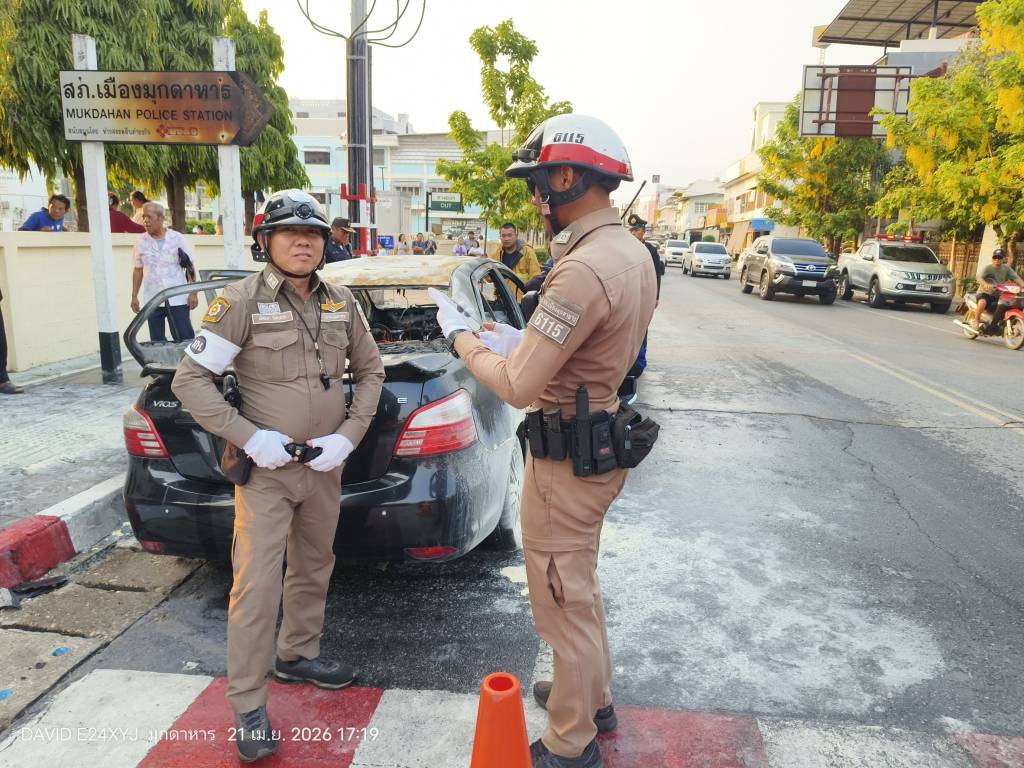 วันที่ 21 เมษายน 2569 ศูนย์รับแจ้งเหตุเพลิงไหม้และบรรเทาสาธารณภัย 199 เทศบาลเมืองมุกดาหาร อำเภอเมือง จังหวัดมุกดาหาร ได้รับแจ้งเหตุไฟไหม้รถยนต์บริเวณถนนหน้าอาคารอุบัติเหตุและฉุกเฉิน โรงพยาบาลมุกดาหาร ถนนวิวิธสุรการ ภายในเขตเทศบาลเมืองมุกดาหาร หลังรับแจ้งเจ้าหน้าที่ดับเพลิงพร้อมรถน้ำได้เร่งรุดไปยังที่เกิดเหตุ