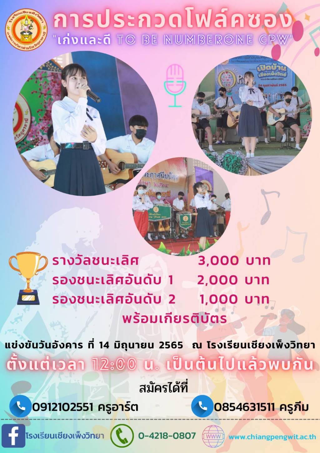 วันที่ 8 มิถุนายน 2565 นายเกรียงศักดิ์ เพชรดี ผู้อำนวยการโรงเรียนเชียงเพ็งวิทยา ในสังกัดองค์การบริหารส่วนจังหวัดอุดรธานี ขอเชิญนักเรียนในระดับการศึกษาขั้นพื้นฐาน ( ป.1 - ม.6) สถานศึกษาใดก็ได้ สมัครเข้าร่วม การประกวดโฟล์คซอง เก่งและดี TO BE NUMBERONE CPW ชิงเงินรางวัล พร้อมเกียรติบัตร สนใจสอบถามได้ที่ 09-1210-2551 ครูอาร์ต และ 08-5463-1511 ครูภีม หรือ โทร 0-4218-0807 รับสมัครแล้ววันนี้ และจะทำการประกวดแข่งขัน ในวันอังคารที่ 14 มิถุนายน 2565 ณ เวทีโรงเรียนเชียงเพ็งวิทยา