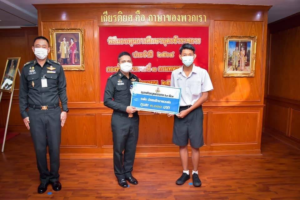 ________ เมื่อวันที่ 9 มิถุนายน 2564 ที่ค่ายพระยอดเมืองขวาง ตำบลกุรุคุ อำเภอเมือง จังหวัดนครพนม ผู้สื่อข่าวรายงานว่า พันโท ศรณณัฐ นวลมณี ผู้บังคับกองพันทหารราบที่ 3 กรมทหารราบที่ 3 (ผบ.ร.3 พัน.3)พร้อมด้วย คณะนายทหาร จัดพิธีมอบทุนการศึกษาให้กับบุตรหลานของกำลังพล หน่วย ร.3 พัน.3 ตามแนวนโยบายของกองทัพบก โดยมีวัตถุประสงค์ เพื่อส่งเสริมการศึกษาของบุตรข้าราชการของหน่วย อันจะก่อให้เกิดผลดีในการพัฒนาประสิทธิภาพบุตรของกำลังพล ให้บุตรหลานกำลังพลของหน่วยมีความประพฤติดี อยู่ในระเบียบวินัยขยันหมั่นเพียรใฝ่เรียน ใฝ่ศึกษา และเป็นบุคลากรที่มีประสิทธิภาพของประเทศชาตินอกจากนั้นยังเป็นการแบ่งเบาภาระค่าใช้จ่ายด้านการศึกษาของบุตร และเป็นขวัญกำลังใจแก่กำลังพลและครอบครัว โดยใช้รูปแบบการมอบทุนแบบออนไลน์ เพื่อป้องกันการแพร่ระบาดของเชื้อไวรัสโควิด -19 ในโอกาสนี้ ผบ.ร.3 พัน.3 ได้กล่าวให้โอวาท ทางออนไลน์ผ่านระบบ Zoom กองทัพบกได้มีนโยบายในการมอบทุนการศึกษาแก่บุตรข้าราชการและลูกจ้างประจำของกองทัพบก โดยเล็งเห็นว่าการส่งเสริมการศึกษาของบุตรข้าราชการ เป็นการพัฒนากองทัพบกอีกทางหนึ่ง และเป็นสิ่งที่จะต้องดำเนินการ เพราะถือว่าการศึกษาเป็นพื้นฐานของการพัฒนาทรัพยากรมนุษย์ ด้วยเหตุผลดังกล่าว กองทัพบกจึงได้มอบแนวนโยบายให้หน่วยขึ้นตรงของกองทัพบก ได้พิจารณา สนับสนุนส่งเสริมบุตรข้าราชการในทุกระดับชั้นยศ โดยเฉพาะข้าราชการชั้นผู้น้อยที่มีความประพฤติดี มีบุตรที่ขยันหมั่นเพียร ใฝ่เรียน ไฝ่ศึกษา เพื่อให้เป็นบุคลากรที่มีความรู้ความสามารถ และมีประสิทธิภาพ ตลอดจนสามารถสอบเข้าศึกษาในสถาบันการศึกษาต่างๆ ตามที่ตนเองถนัด